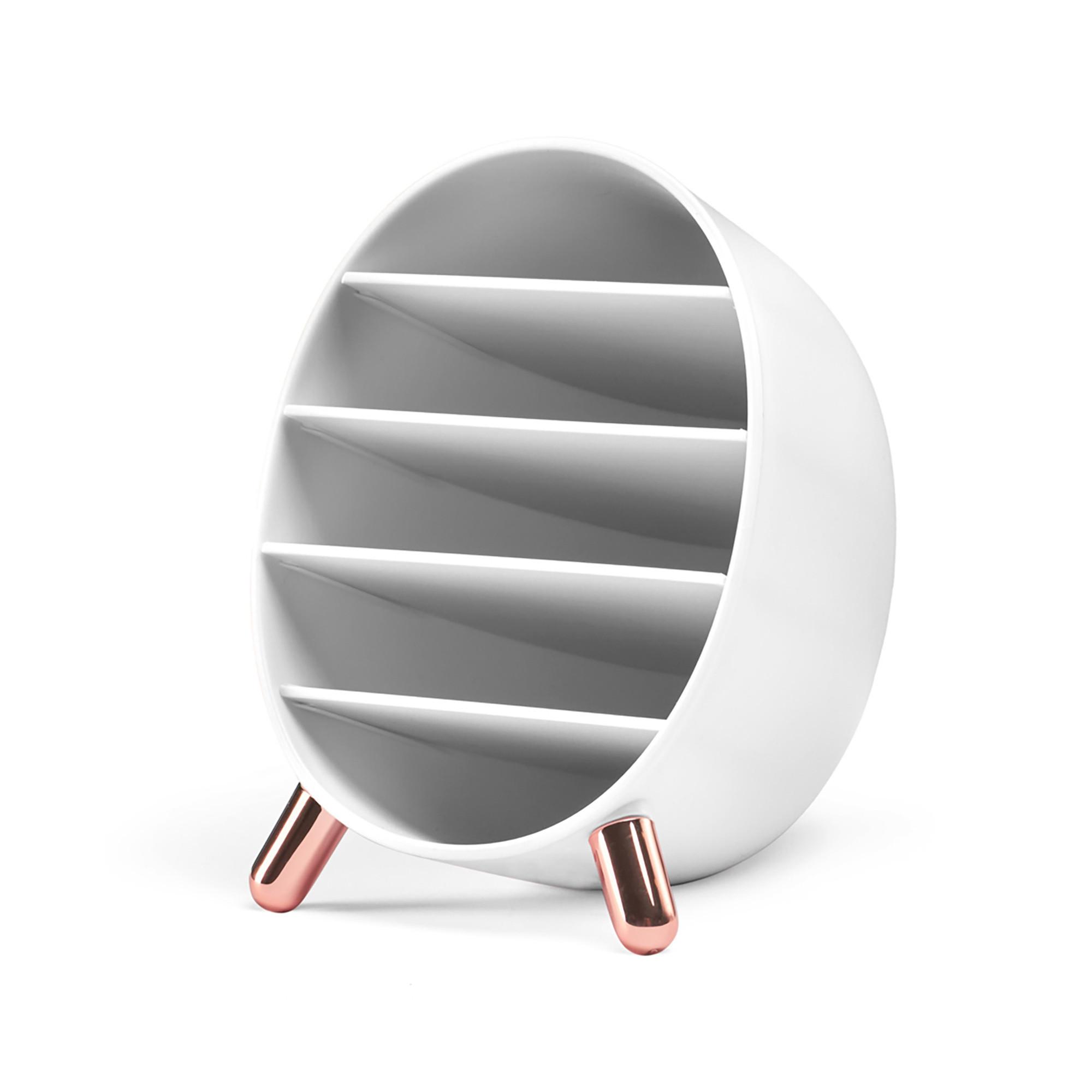 Stilvoller runder Tisch-Organizer in Weiss und mit goldenen Beinen für z.B. Mascara, Eyeliner oder andere kleinere Beauty-Produkte, die leicht zugänglich sein müssen, wenn Sie am Schminktisch sitzen.