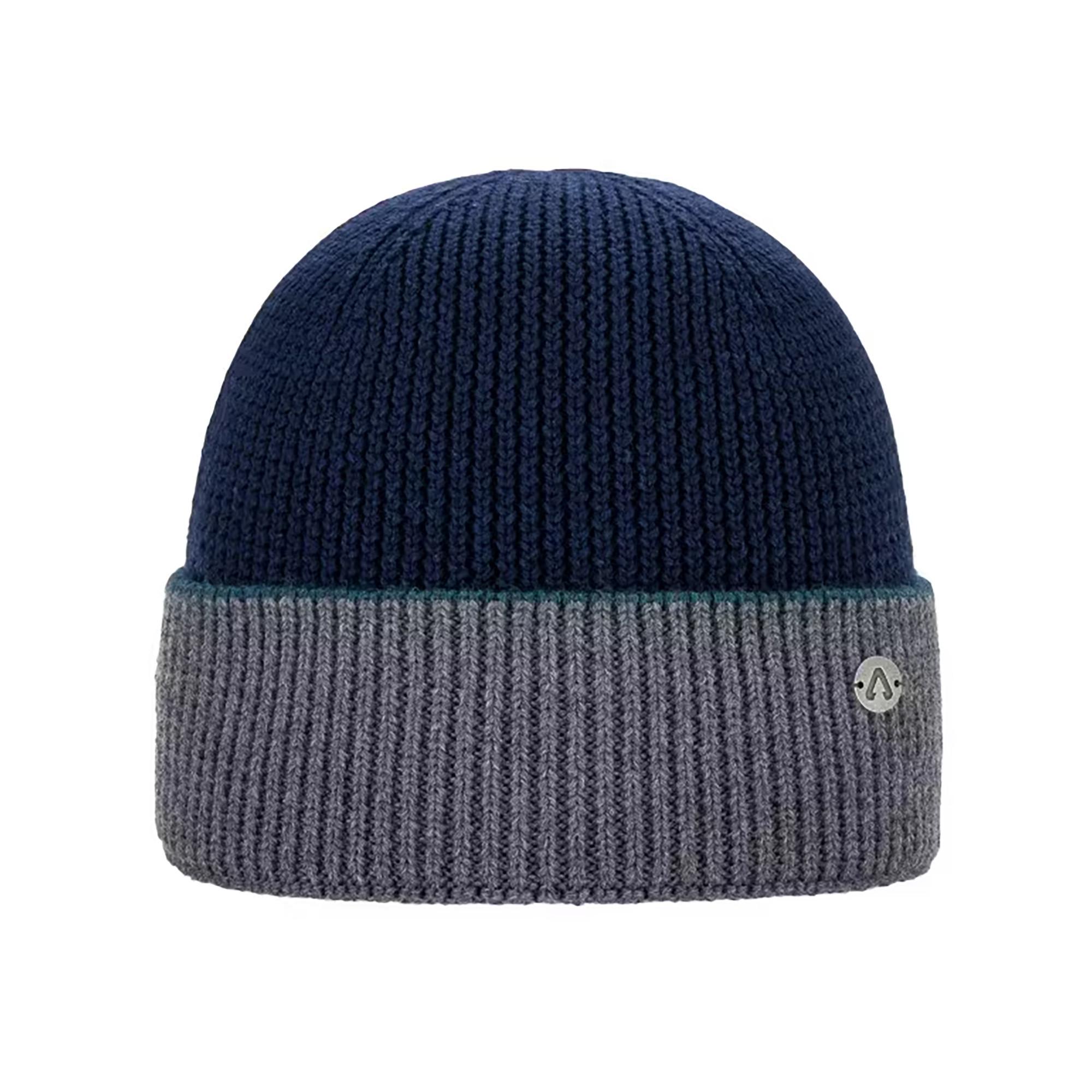 Diese Mütze präsentiert sich in einem stilvollen zweifarbigen Design mit gerippter Stricktextur und bietet ein bequemes und warmes Accessoire. Das Design umfasst ein kleines metallisches Emblem am Umschlag, das dem Gesamterscheinungsbild ein subtiles Detail verleiht.