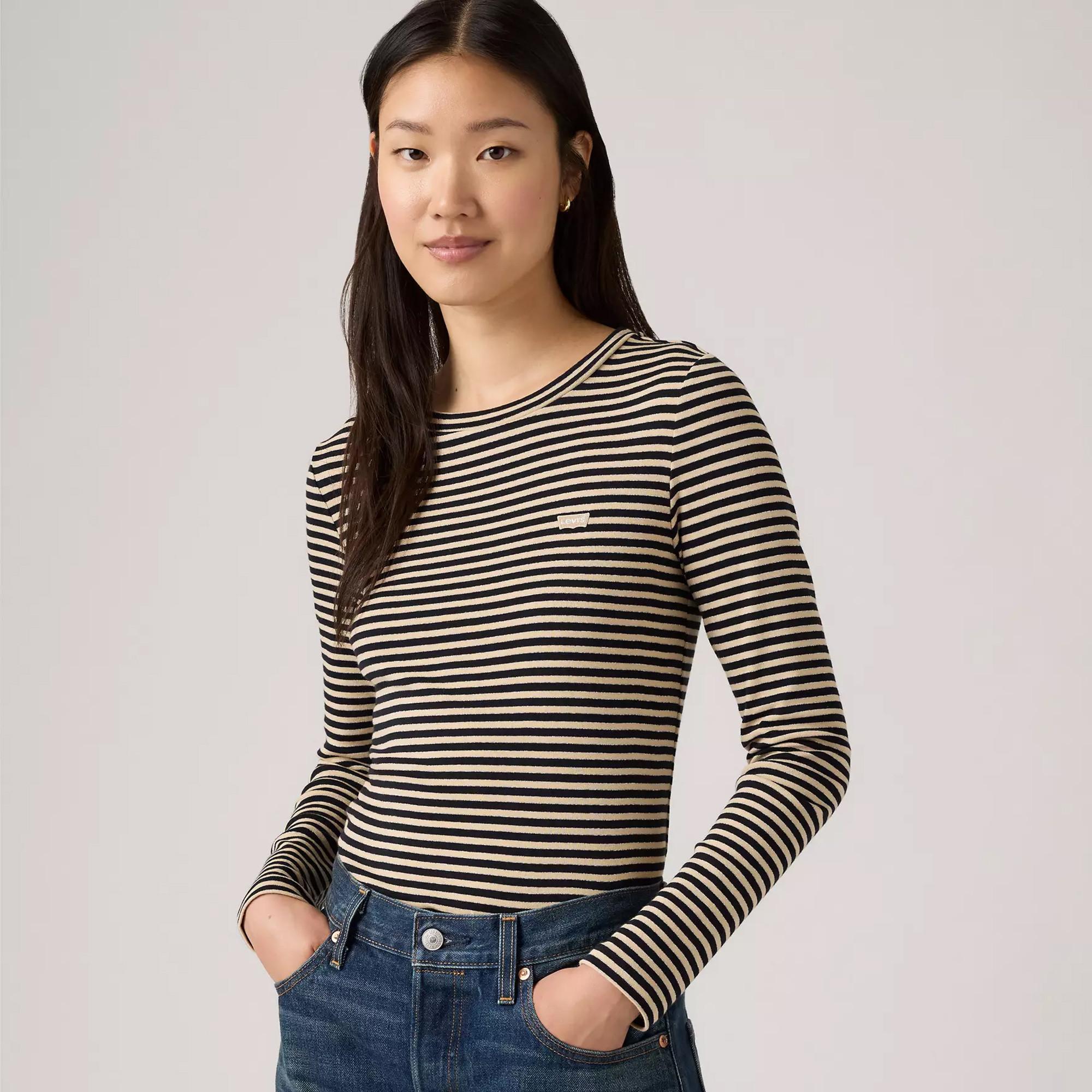 Dieses Langarm-T-Shirt präsentiert sich mit einem klassischen Streifenmuster und ist eine zeitlose sowie vielseitige Ergänzung für jede Garderobe. Das Design umfasst einen Rundhalsausschnitt und ein kleines gesticktes Logo-Detail auf der Brust, das einen dezenten Markenakzent setzt.