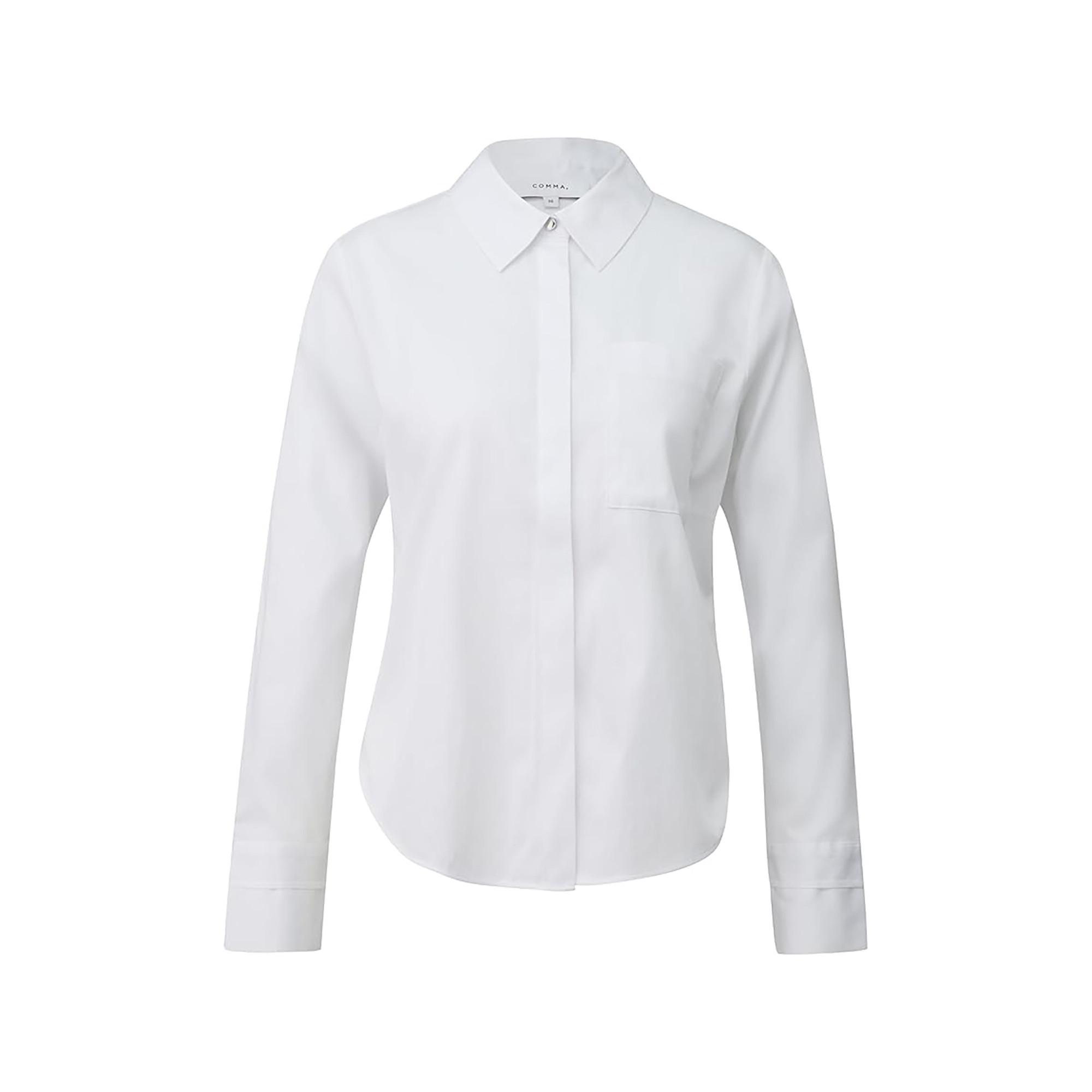 Die Comma Bluse überzeugt mit klassischem Hemdkragen, verdeckter Knopfleiste und aufgesetzter Brusttasche. Die feine Verarbeitung sorgt für ein angenehmes Tragegefühl im Alltag. Ihr zeitloser Look passt sowohl ins Büro als auch zu legeren Outfits.