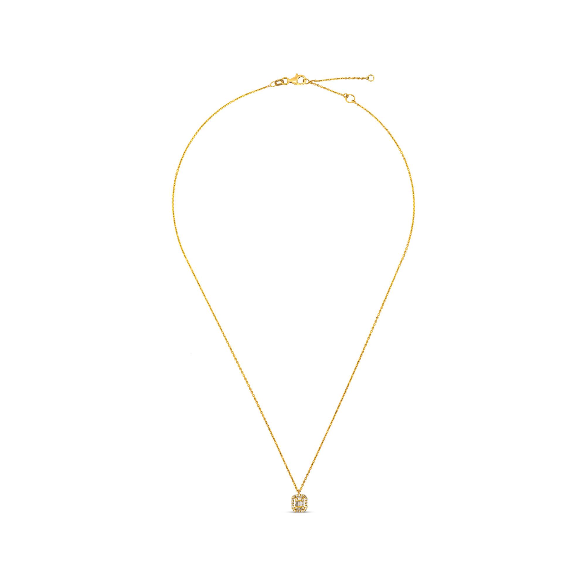 Diese Halskette von Zen Diamonds ist ein feminines Schmuckstück aus 18-karätigem Gold mit einem exquisiten, eckigen Diamant-Anhänger, der von 32 brillant geschliffenen Diamanten geziert wird. Die Kette ist weitenverstellbar und schliesst stilvoll per Karabiner.