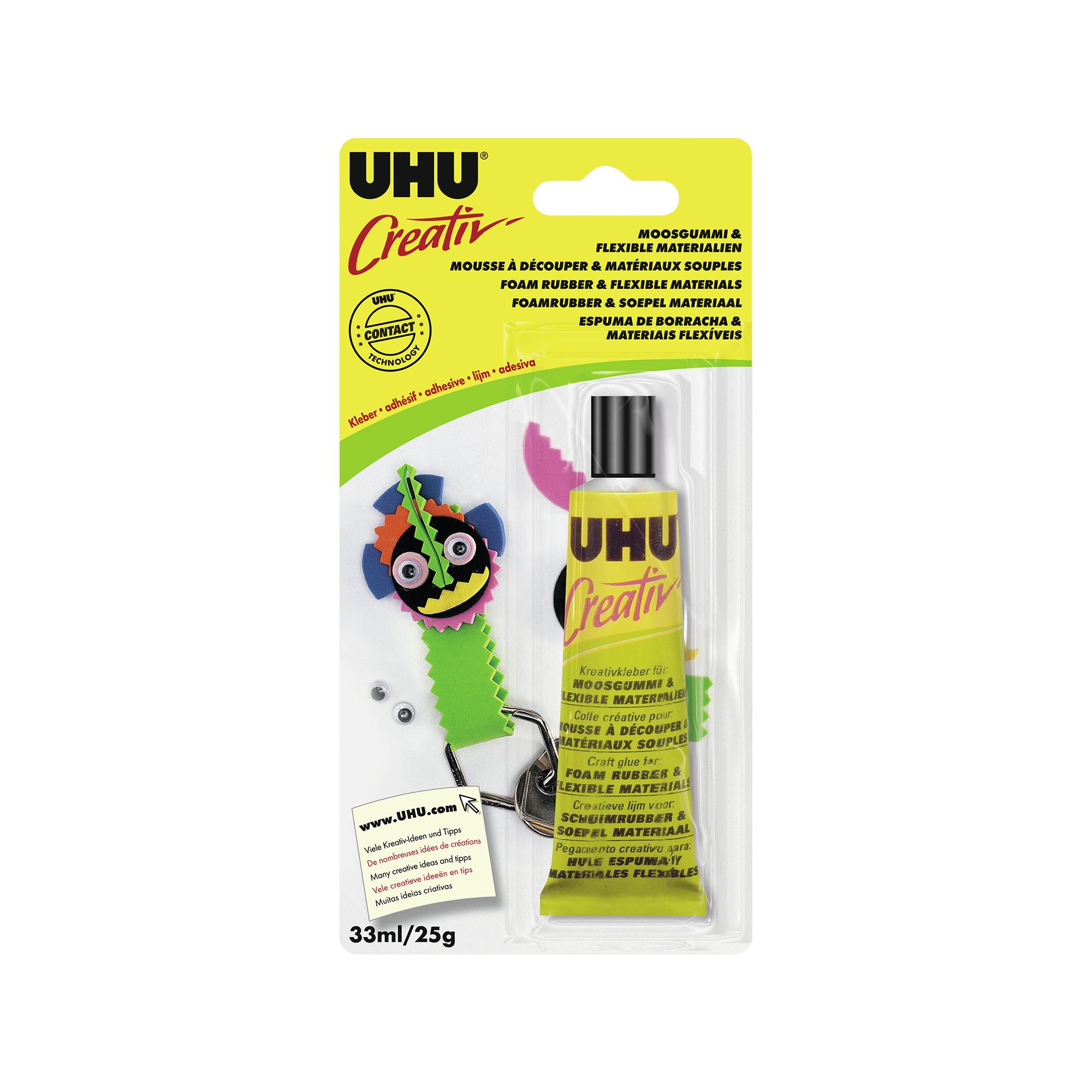 UHU Creativ Spezialklebstoff für Moosgummi & Flexible Materialien ist ein schnell trocknender, flexibler Kontaktklebstoff. Die besonders starke Formel ist farblos, geruchsarm, wird nicht spröde und hat eine gute Anfangshaftung für das perfekte Kleben von Moosgummi und anderen flexiblen Materialien, zum Gestalten von Bildern, Collagen, Blumen, Mobilés, Fingerpuppen, etc. Der elastische Klebefilm ist wasser- und temperaturbeständig und enthält keine Säuren oder Basen.