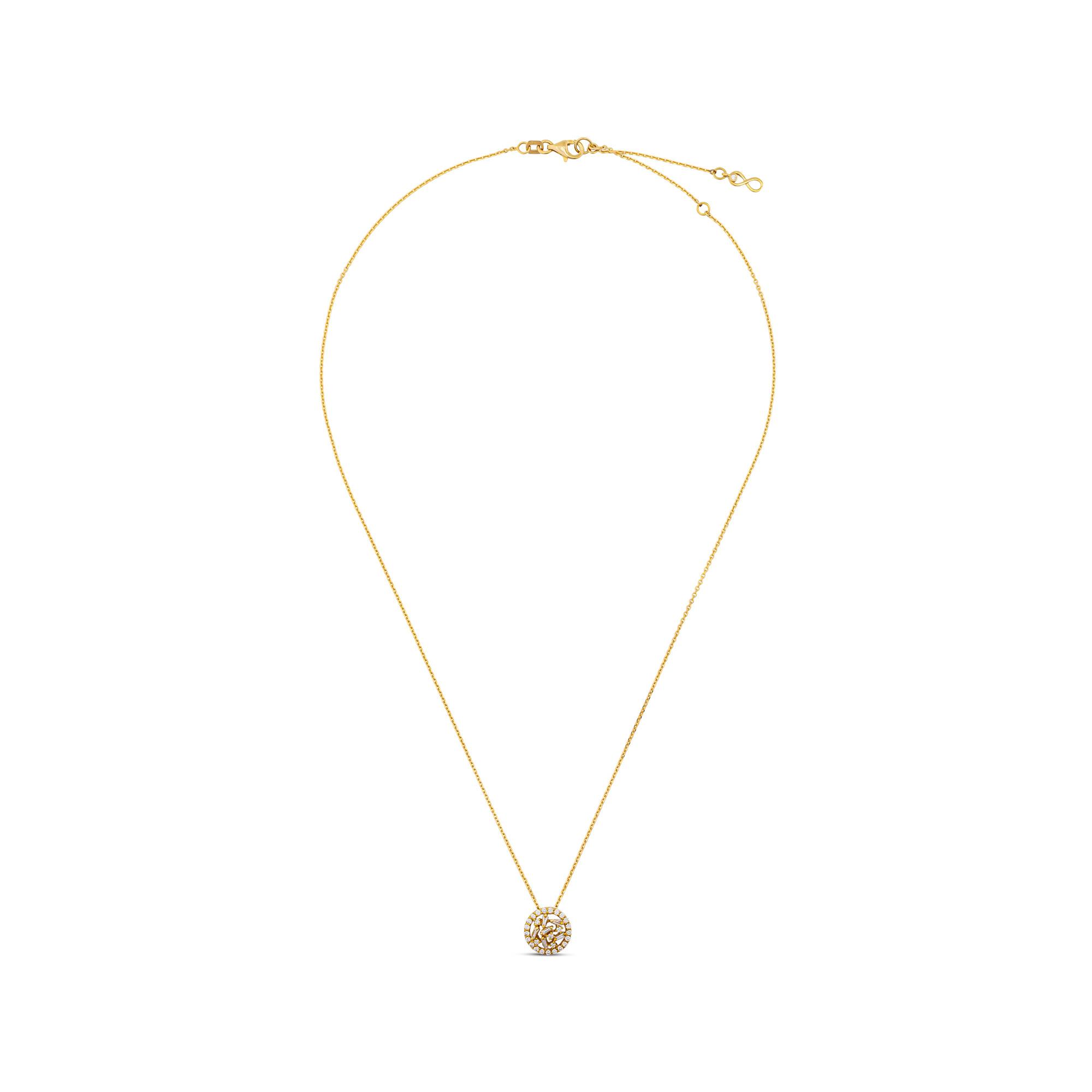Diese Halskette von Zen Diamonds ist ein feminines Schmuckstück aus 18-karätigem Gold mit einem exquisiten, runden Anhänger, der von brillant geschliffenen Diamanten geziert wird. Die Kette ist weitenverstellbar. Am Karabinerverschluss lässt das Symbol der Unendlichkeit, die liegende Acht, Tiefsinnigkeit erahnen.