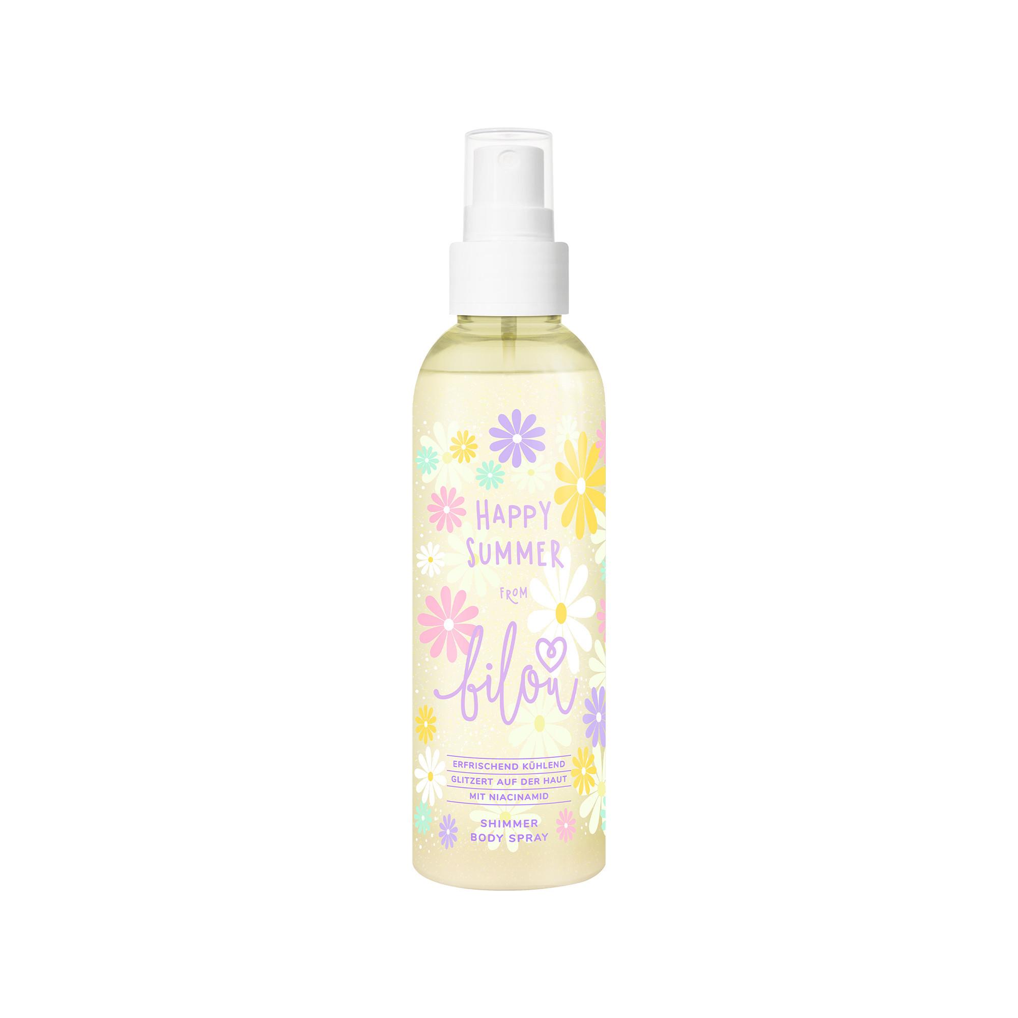 Der Bilou Schimmer Bodyspray Happy Summer entführt mit seinem Duft nach Jasminblüte, herbem Moschus und erfrischender Limette in warme Sommernächte. Erfrischend und belebend, verleiht es der Haut dank Glitzerpartikel einen schönen Glow. Die pflegende Formel, angereichert mit Glycerin und Niacinamid, trägt zur Erfrischung und Kühlung der Haut bei. Dank des tollen Duftes geniesst man ein anhaltendes, bezauberndes Frischegefühl.