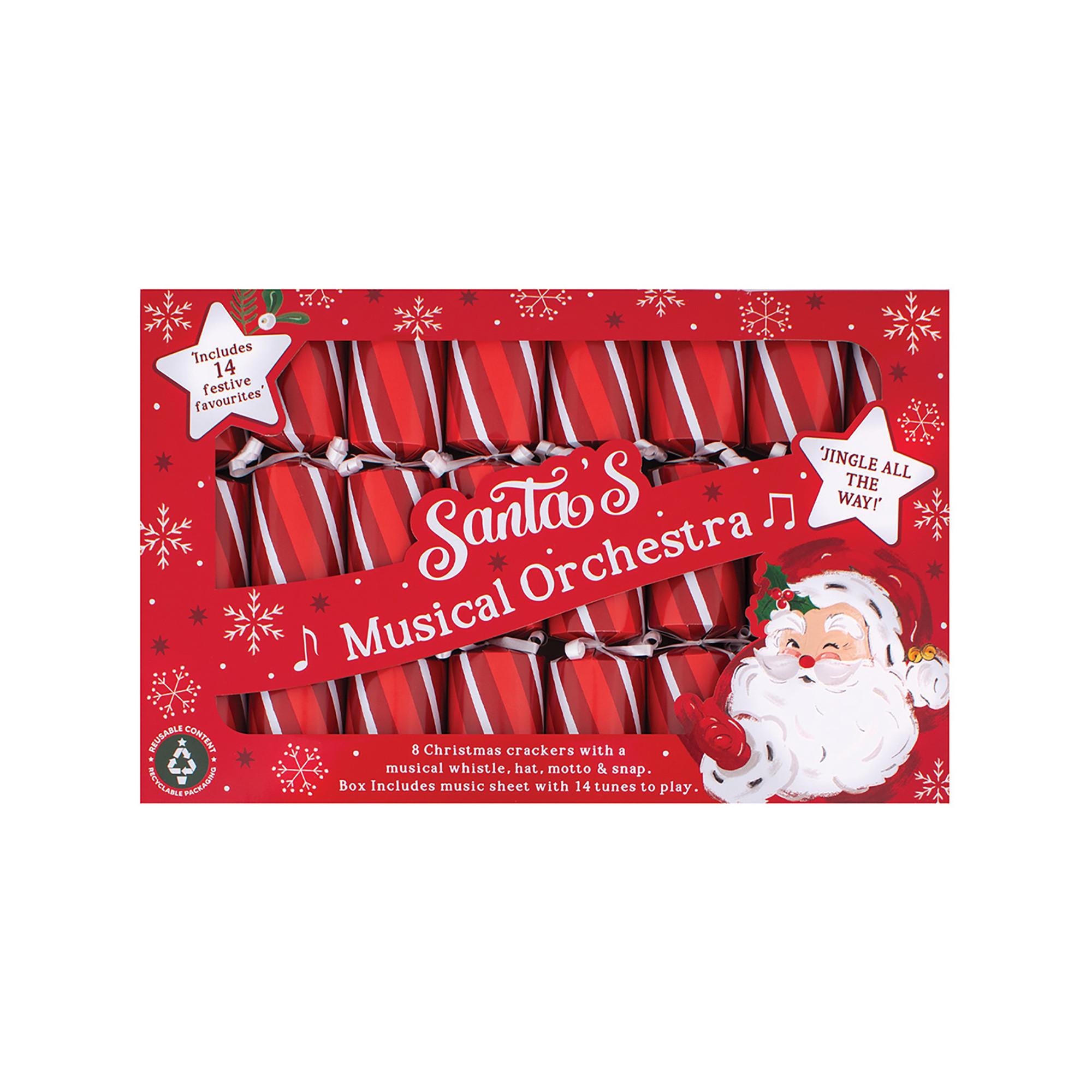 Festliche Crackers mit Pfeife, Hut, Spruch und Knallgeräusch. Die Box enthält ein Musikblatt mit 14 Melodien zum Nachspielen – sorgt für Spass, Überraschung und musikalische Unterhaltung auf der Weihnachtstafel.