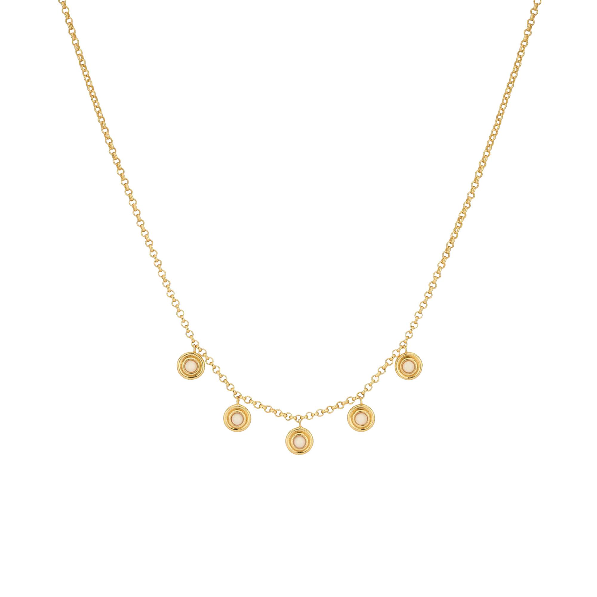 Diese zarte Halskette von 24Kae ist mit fünf kleinen Anhängern verziert, die jeweils eine lichtrosafarbene Zirkonia tragen. Perfekt kombinierbar mit der passenden Armband-, Ohrring- und Ringkollektion für einen stimmigen Sommer-Look.