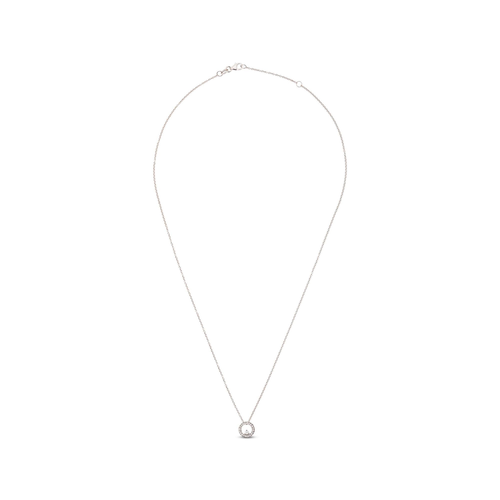 Diese Halskette von Sergio Ferris ist aus 18-karätigem Weissgold gefertigt, mit einem frei beweglichen runden Anhänger, der mit 21 Diamanten lichtdurchlässig besetzt ist. Der filigrane Schmuck ist in der Länge variabel und schliesst stilsicher per Karabinerverschluss.