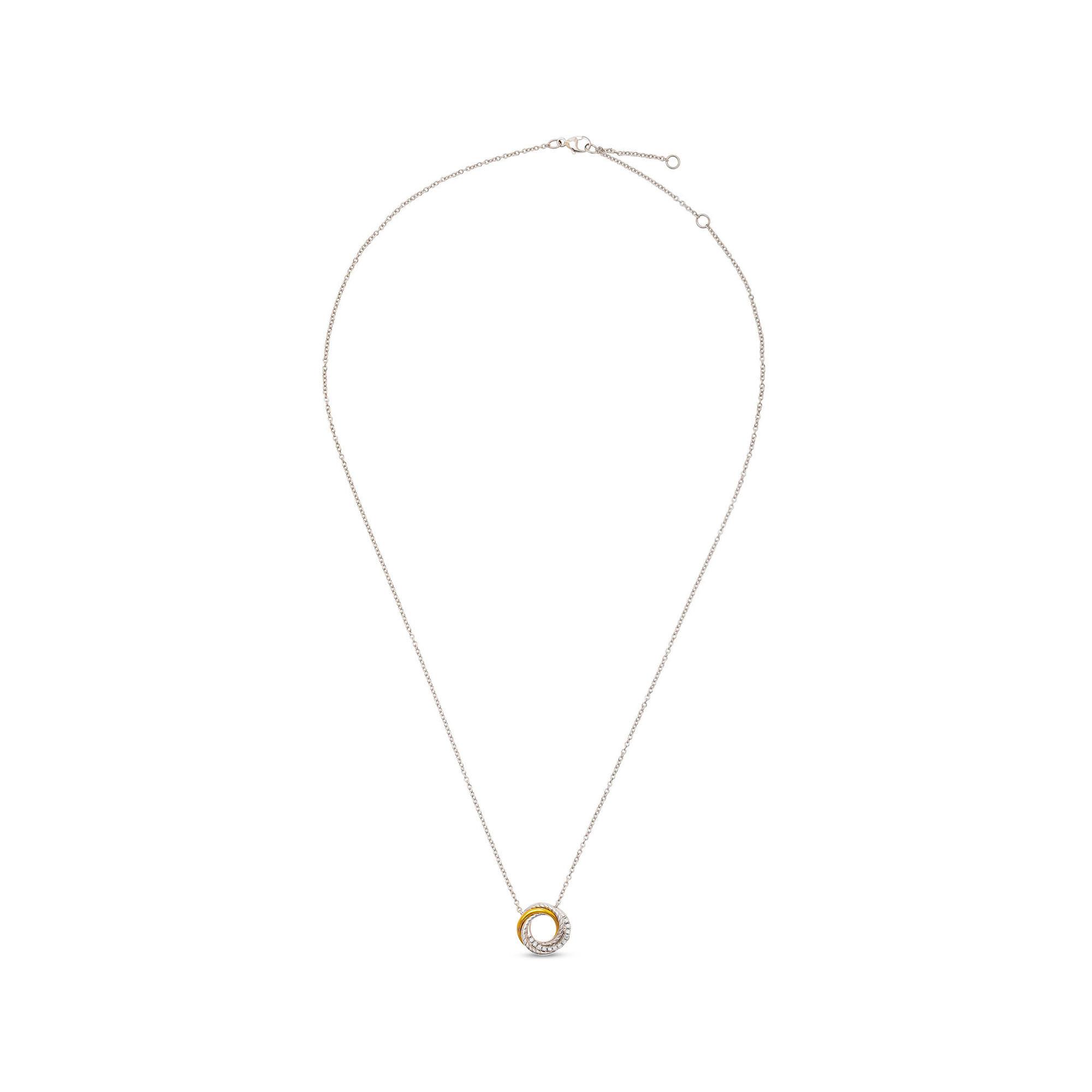 Diese Halskette von Sergio Ferris ist aus 18-karätigem Weiss- und Gelbgold gefertigt, mit einem dynamisch in sich gedrehten, runden Anhänger, der mit lichtdurchlässig gefassten Diamanten besetzt ist. Der filigrane Schmuck ist in der Länge variabel und schliesst stilsicher per Karabinerverschluss.