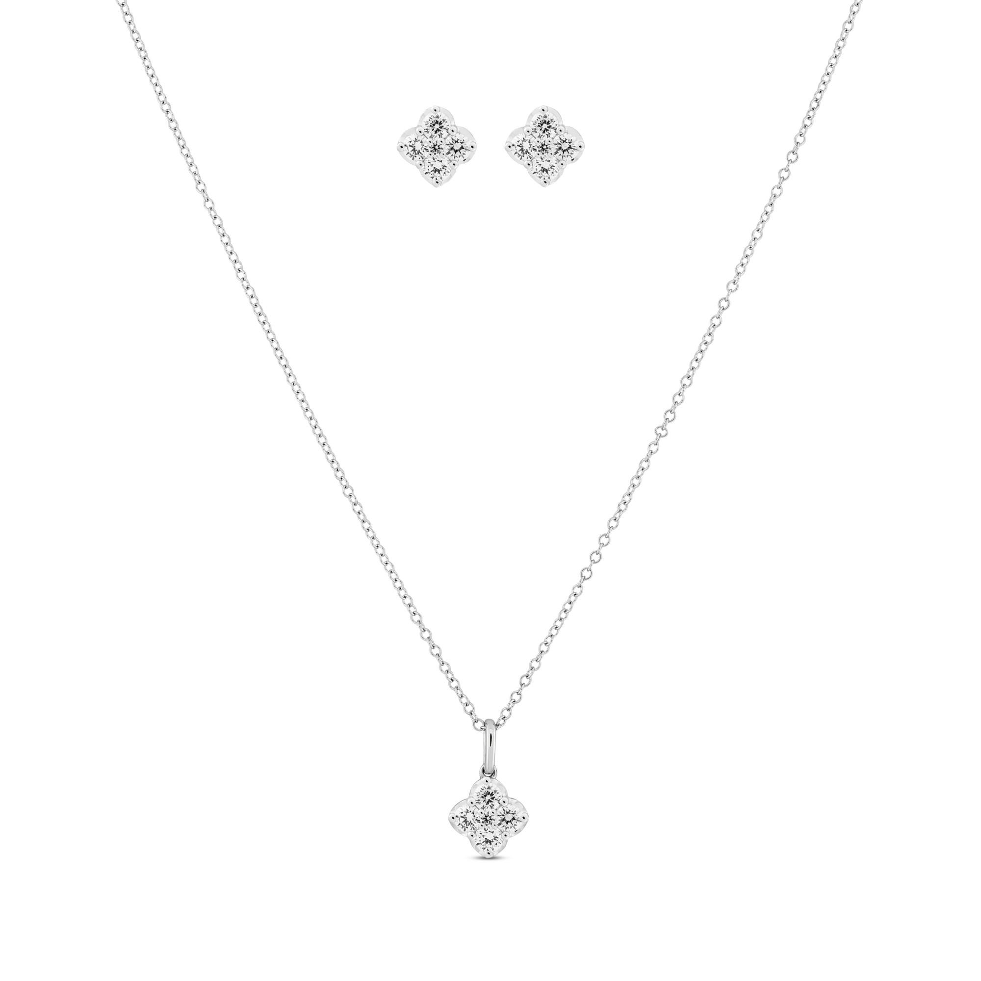 Dieses Schmuck-Set von Sergio Ferris aus 18-karätigem Weissgold und Brillanten besteht aus einem zarten Collier und passenden Ohrsteckern. Das klassische Design lässt sich einerseits als Alltagsschmuck tragen, krönt jedoch vor allem die elegante Garderobe zu besonderem Anlass.