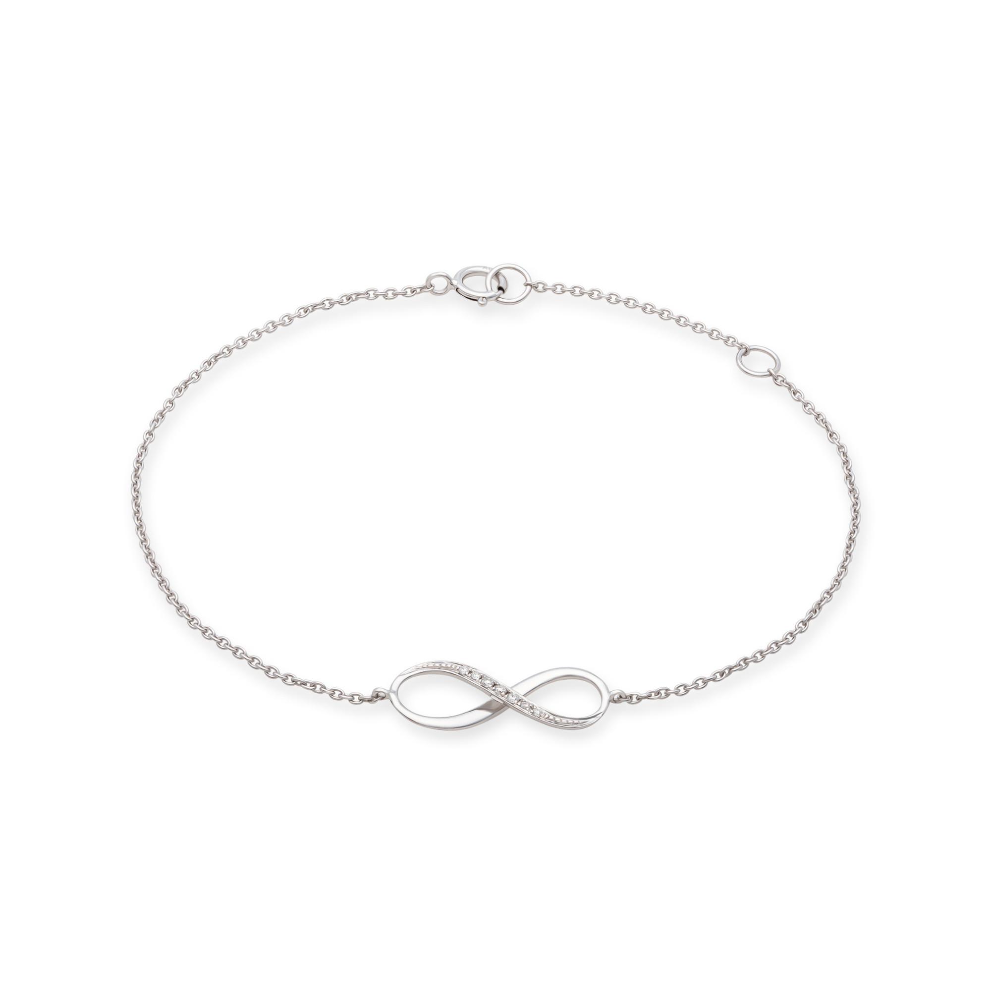 Dieses Armband von L'Atelier Gold 18 Karat by Manor ist aus reinem Weissgold und sieben Brillanten hergestellt. Das zarte Kettchen ist mit der tiefen Symbolik der liegenden Acht und der kostbaren Steine ein zeitloses Schmuckstück mit besonderer Ausstrahlung.