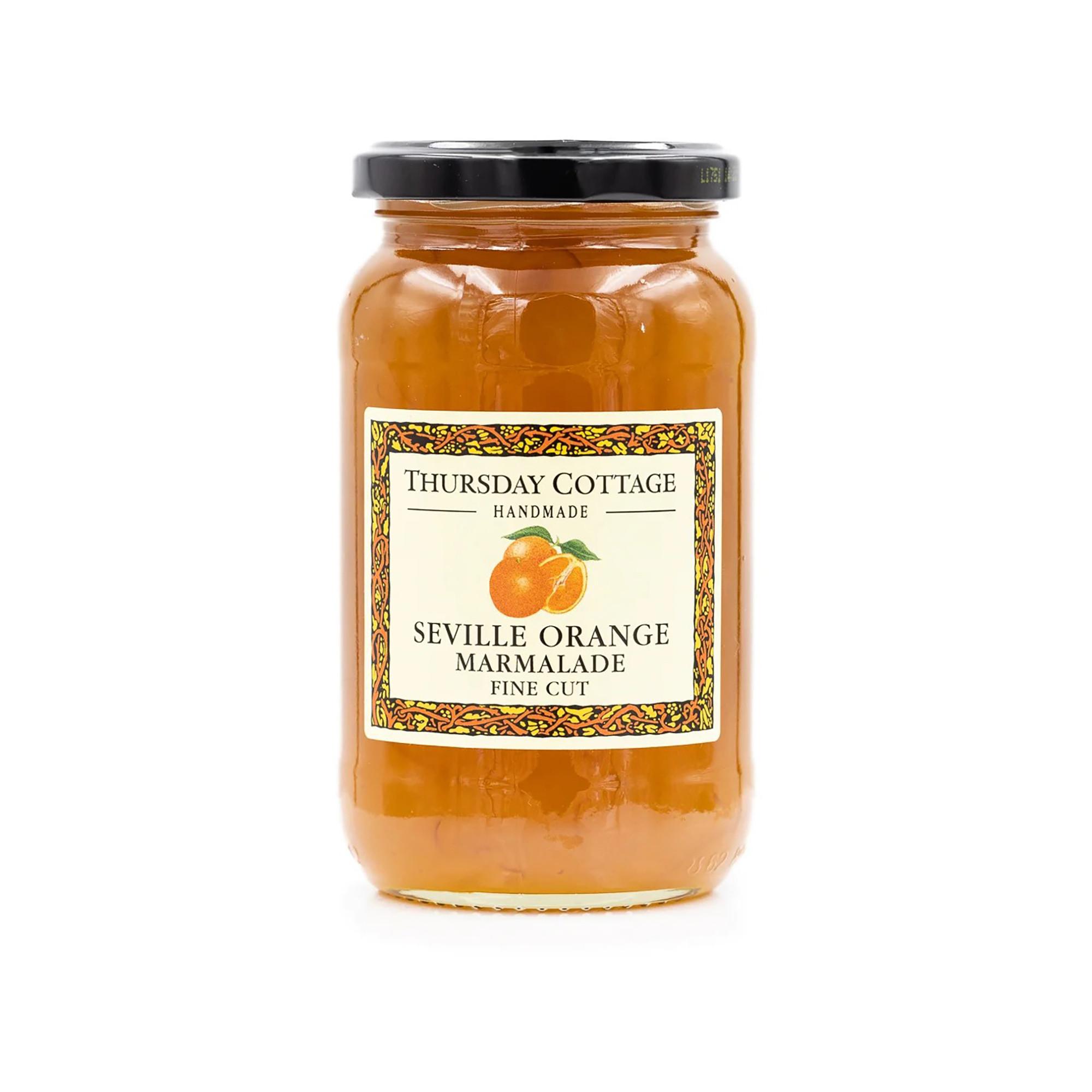Die Seville Orange Marmalade Fine Cut von Thursday Cottage besticht durch den intensiven, leicht herben Geschmack originaler Sevilla-Orangen. Fein geschnittene Orangenschalen sorgen für eine streichzarte Textur, ideal für Toast, Scones oder Croissants, zum Backen oder als Füllung für Kuchen und Kekse.