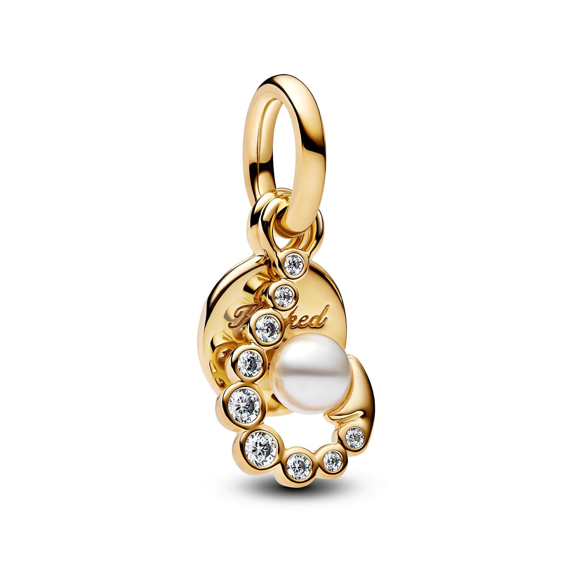 Feiere die Menschen, die dir am wichtigsten sind, mit dem Sonnenaufgang Medaillon Charm, das einen vergoldeten Doppel-Anhänger mit weiß lackierter Kunstperle und klaren Cubic Zirkonia hat und die Verbindung symbolisiert, die dich ganz nahe hält.