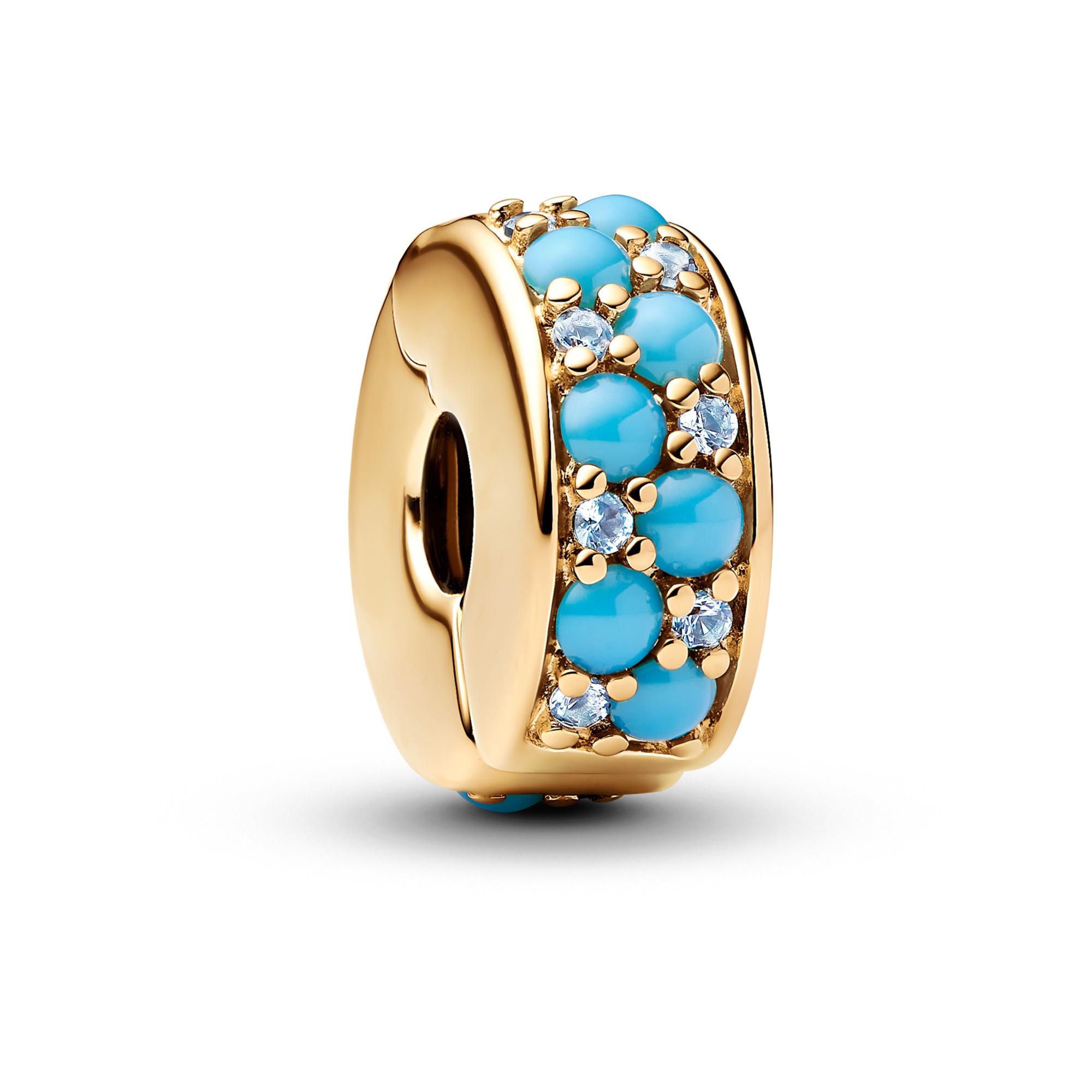 Entdecke den Aquablaue Clip-Charm mit den vergoldeten Clips mit eisblauen und capriblauen Kristallen und Silikonkern. Dieser mit Sorgfalt hergestellte Charm ist perfekt für alle, die die Freiheit und Lebendigkeit des Meeres lieben.