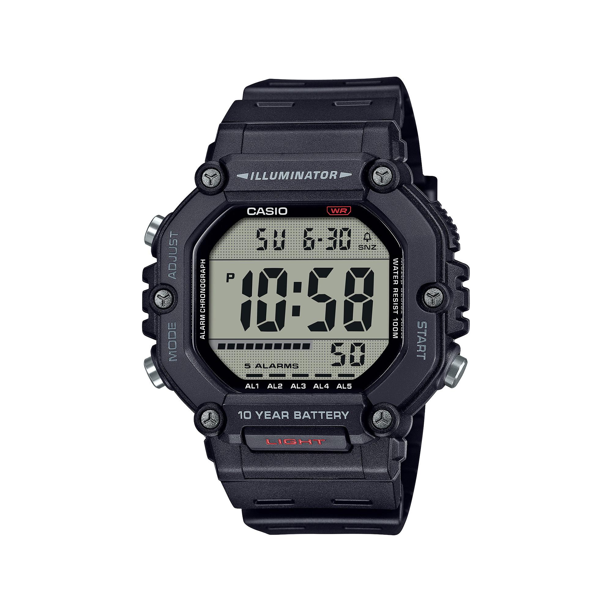 Diese sportliche Uhr besticht durch ihr grosses, gut ablesbares LC-Display und ein robustes Gehäuse, das mit einer leicht bedienbaren LED-Beleuchtung überzeugt. Mit 10 Bar Wasserdichtigkeit, einer Batterielaufzeit von bis zu 10 Jahren und praktischen Funktionen wie Dualzeit, Stoppuhr und Alarm ist sie der perfekte Alltagsbegleiter.