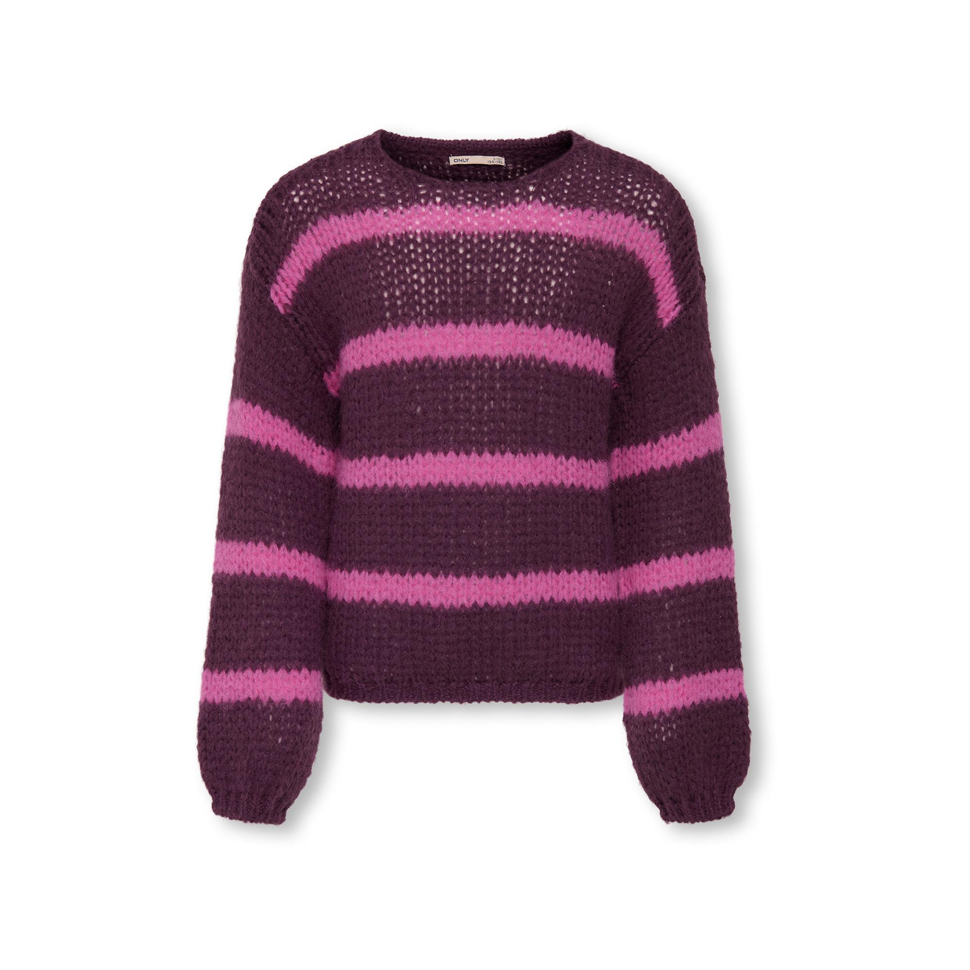 Der KIDS ONLY Pullover „KOGNORDIC LIFE LS O-NECK STRIPES KNT“ ist ein langärmliger Strickpullover mit Rundhalsausschnitt und modischen Streifen in der Farbe „mauve wine“. Das Hauptmaterial besteht zu mindestens 50 % aus recyceltem Polyester – eine nachhaltige Wahl. Der Pullover ist normal geschnitten und bietet angenehmen Tragekomfort für Kinder.