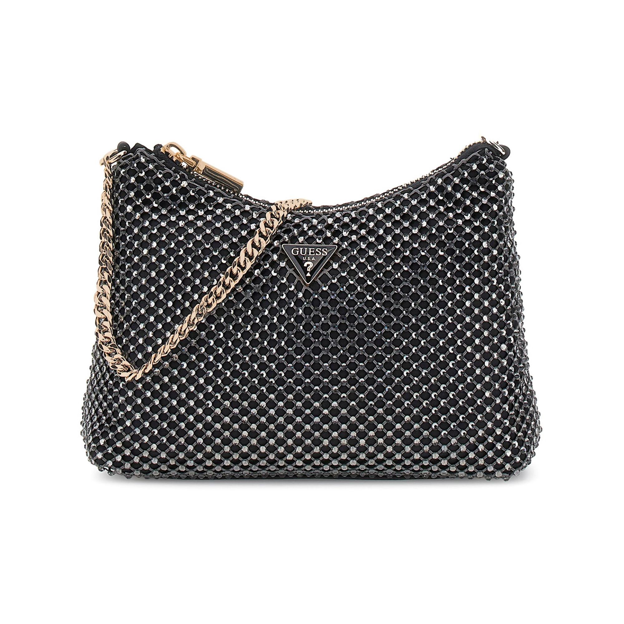 Diese Schultertasche verfügt über ein auffälliges Design mit einer netzartigen Aussenseite, die mit schimmernden Verzierungen versehen ist und ein glamouröses und auffälliges Accessoire darstellt. Die Tasche wird mit einem Reissverschluss oben geschlossen, um die Sicherheit der Gegenstände zu gewährleisten.