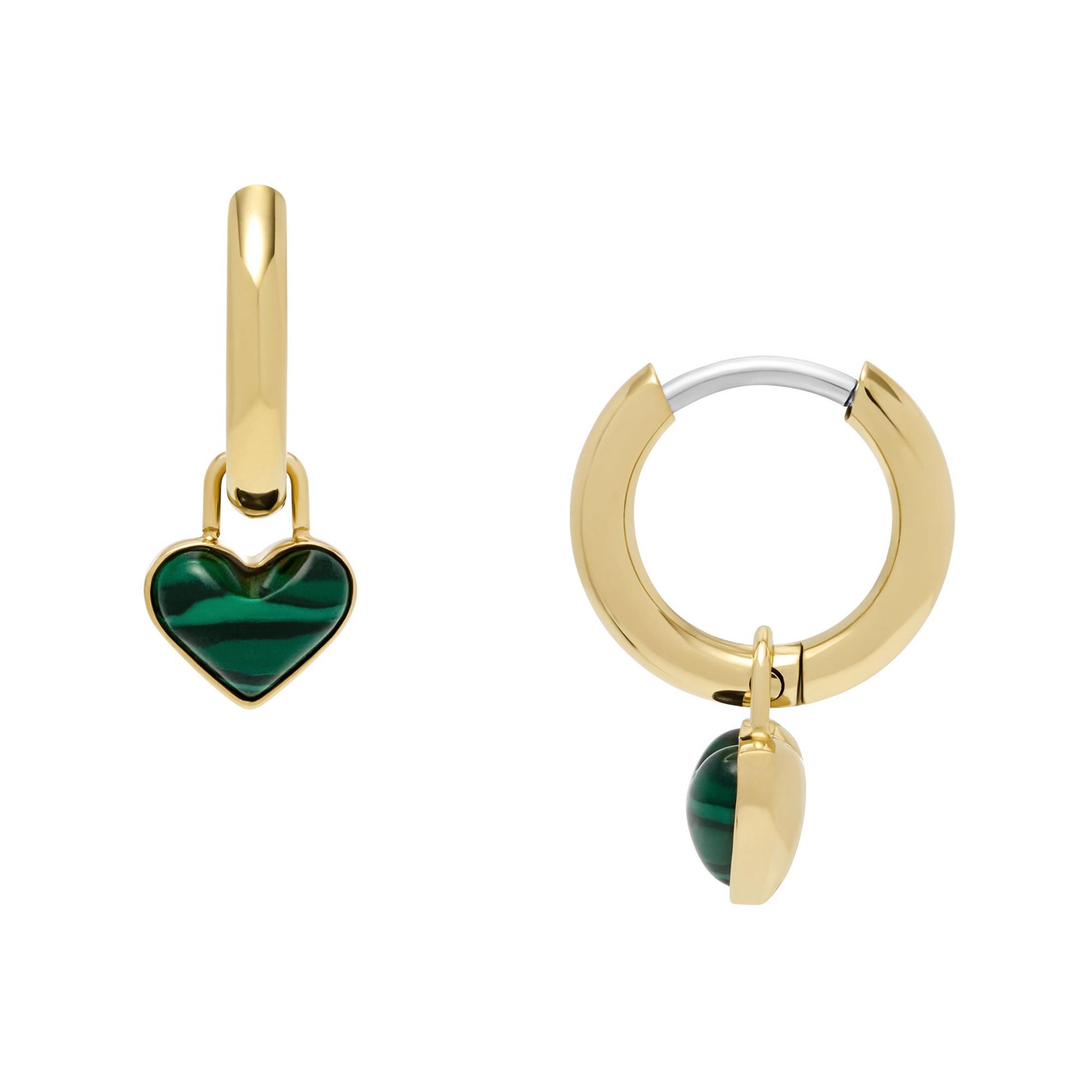 Verleihe Deinem Look mit unserer ausgefallenen Kollektion Modern Meadows das gewisse Etwas. Ein Herz-Charmanhänger aus rekonstruiertem Malachit baumelt von Creolen-Ohrringen aus poliertem, goldfarbenem Edelstahl. Verleihe Deinen Lieblingslooks einen legeren Farbtupfer.