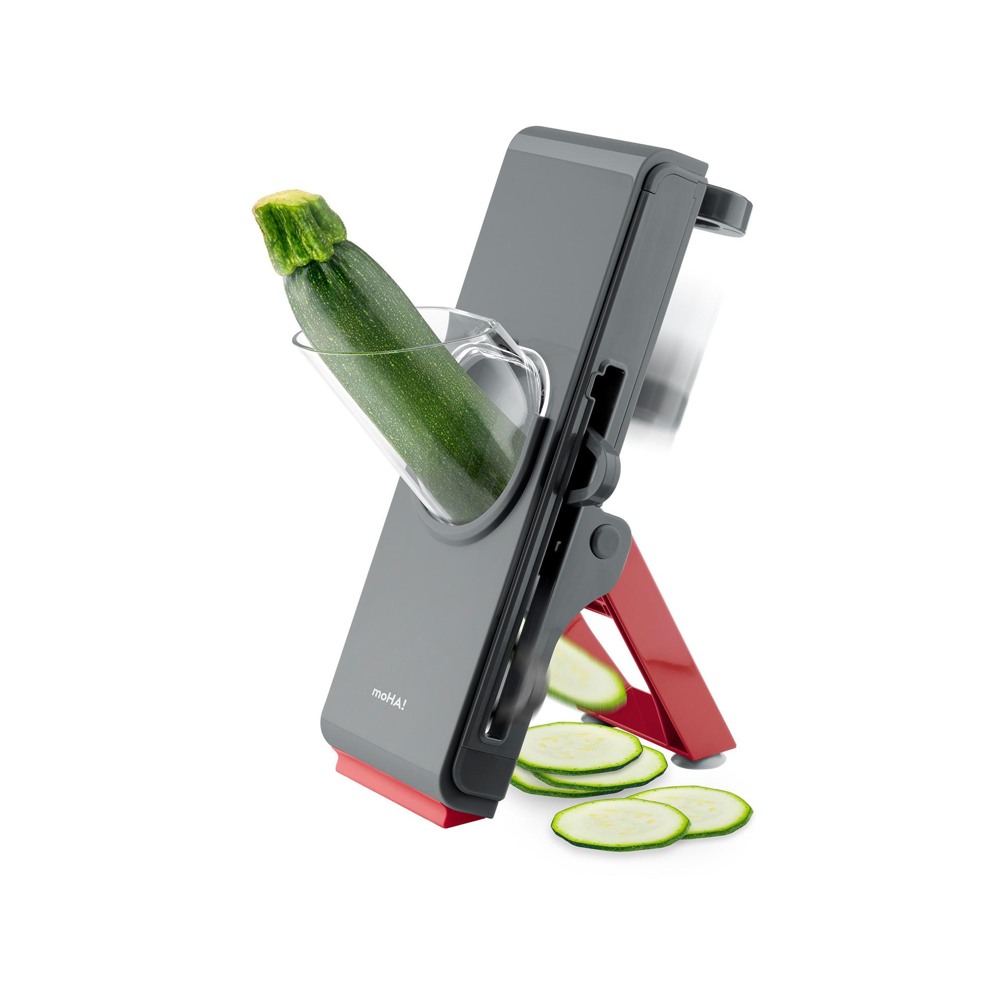 Vertico ist ein innovativer Gemüsehobel mit vertikaler Ausrichtung und Druckknopf für sicheres Schneiden ohne Verletzungsrisiko. Die rutschfeste Basis mit Saugnäpfen sorgt für festen Halt.