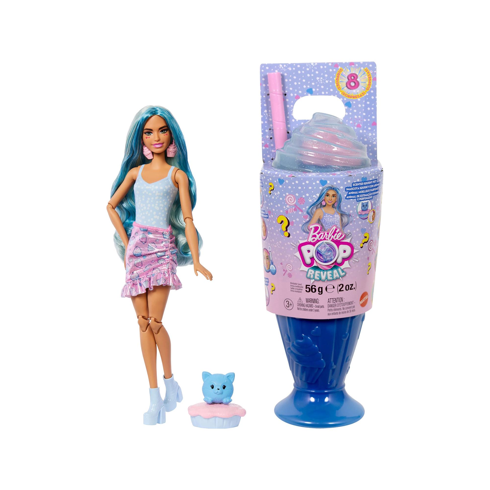 Die Puppen der Pop Reveal Treats-Serie bieten ein spannendes Auspackerlebnis, bei dem beim Öffnen acht Überraschungen auf die Sinne warten. Sobald die Folie vom Becher entfernt wird, erscheinen eine duftende Barbie-Puppe sowie sieben weitere Überraschungen.