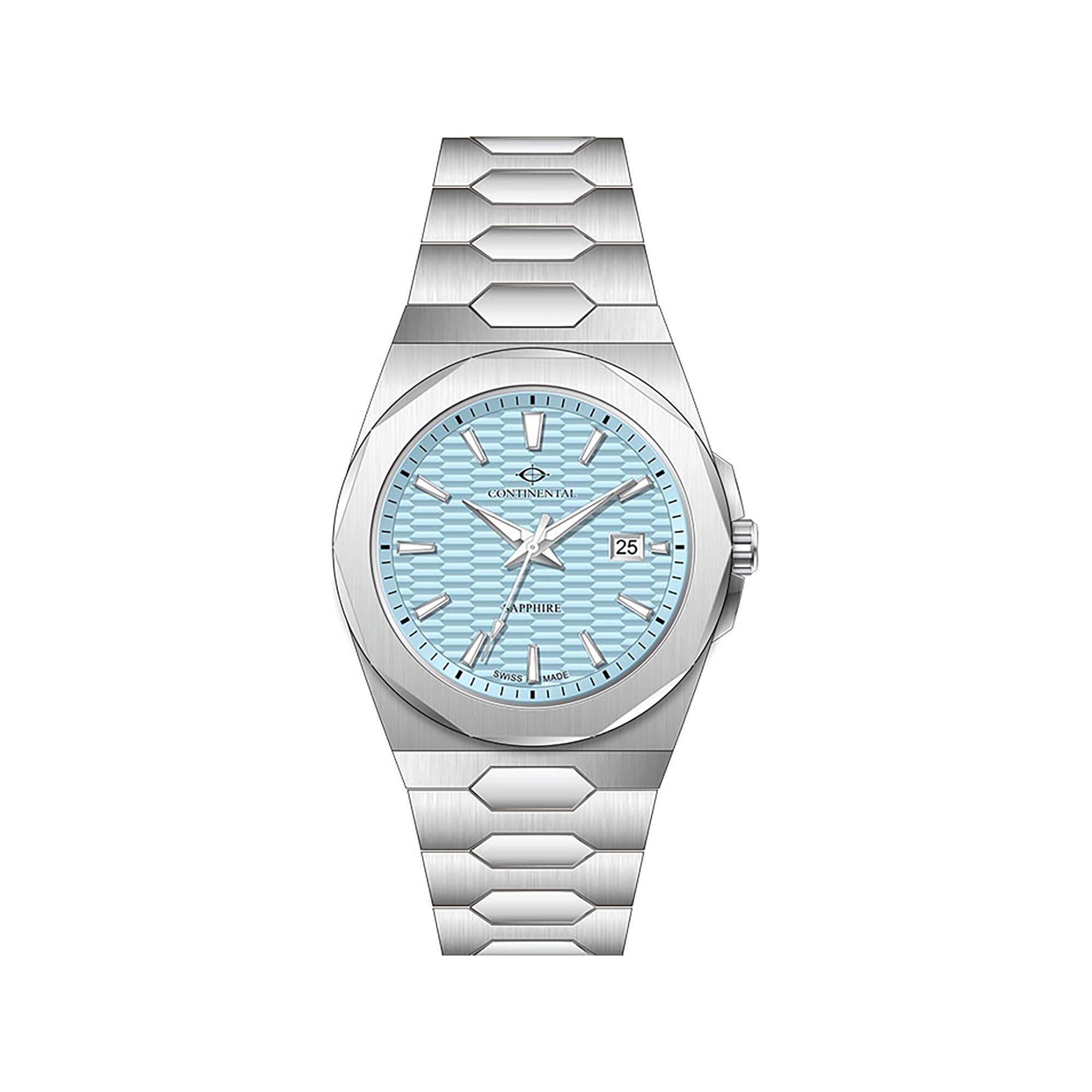 - Kratzfestes Saphirglas, blaues Zifferblatt
