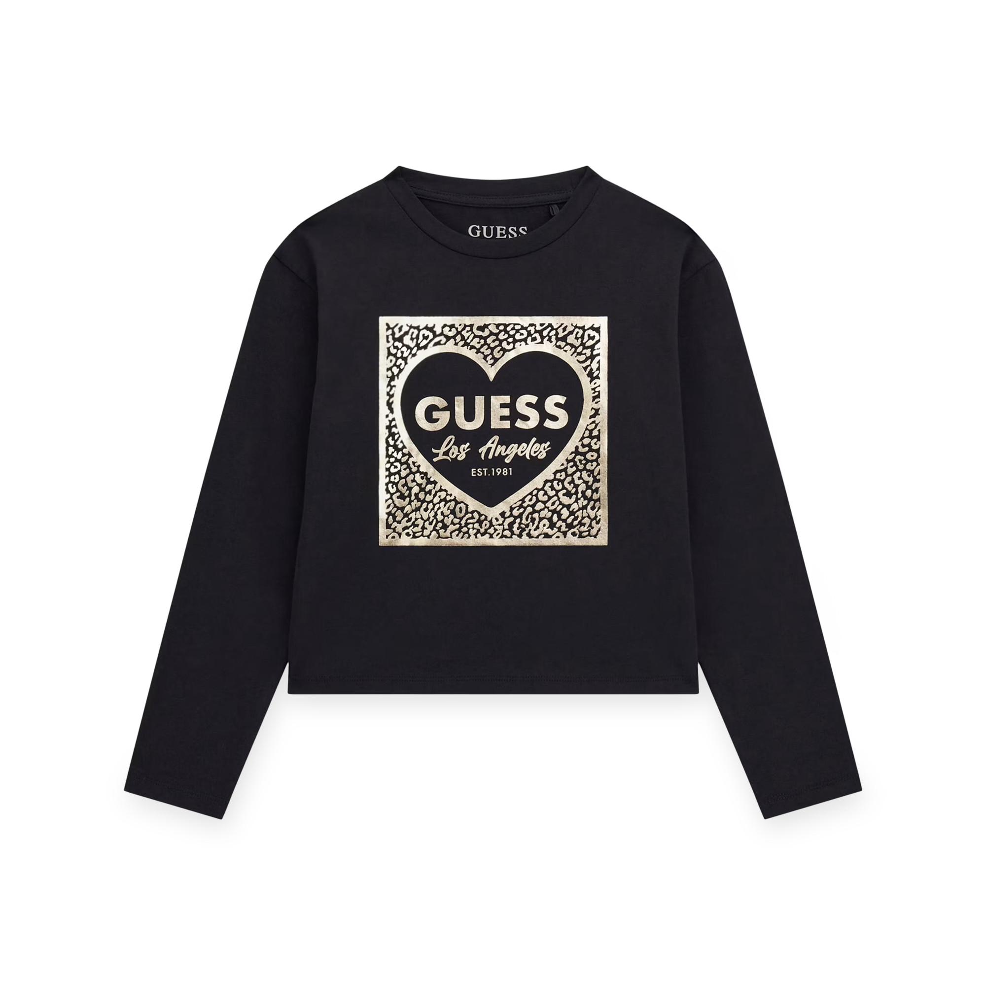 Das Guess Kids T-Shirt besteht aus weichem Baumwolljersey mit einem Anteil an Elasthan für angenehme Bewegungsfreiheit. Es hat einen Rundhalsausschnitt, lange Ärmel und einen glänzenden Logo-Print auf der Vorderseite. Die reguläre Passform macht es zum idealen Basic für einen stilvollen Alltagslook.
