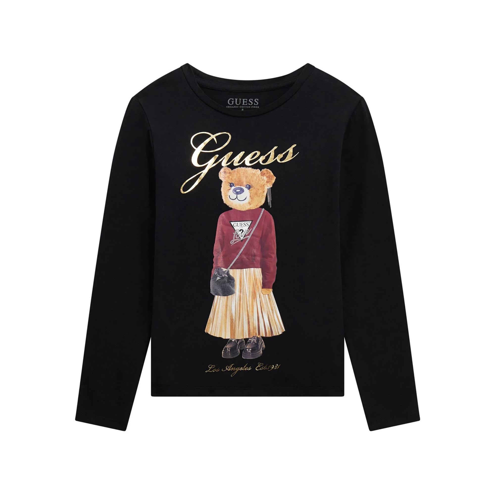Die Guess Kids Bluse ist aus weichem Baumwolljersey mit einem kleinen Elasthan-Anteil gefertigt und bietet eine angenehme Passform. Sie verfügt über einen Rundhalsausschnitt, lange Ärmel und einen glänzenden Logo-Print auf der Vorderseite. Die Regular-Fit-Passform macht sie zum idealen Basic für stilvolle Alltagslooks.
