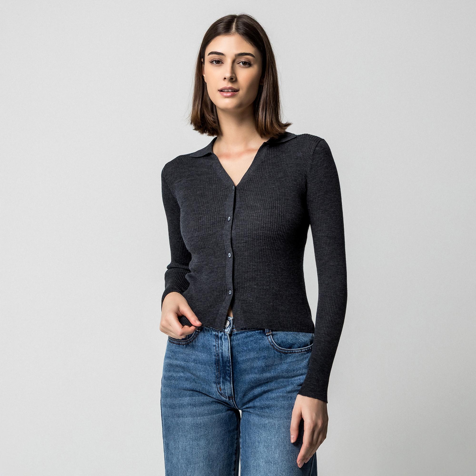 Dieses anliegend geschnittene Top von Marella aus reiner, gerippter Wolle ist ein vielseitiges Basic mit femininem Charakter und zeitloser Eleganz. Der Pullover ist ausgestattet mit Kragen, V-Ausschnitt, durchgehender Knopfleiste und langem Arm.