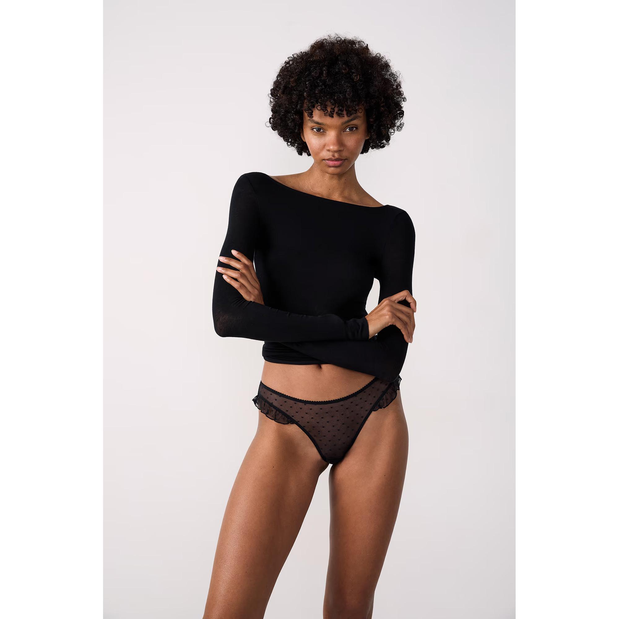 Dieser Tanga präsentiert sich in einem verspielten Design mit zarten Tupfen und Rüschenkanten, eine charmante Ergänzung für jede Dessous-Kollektion. Die Rückseite ist mit einer dekorativen Schleife verziert, die einen Hauch von Eleganz verleiht.
