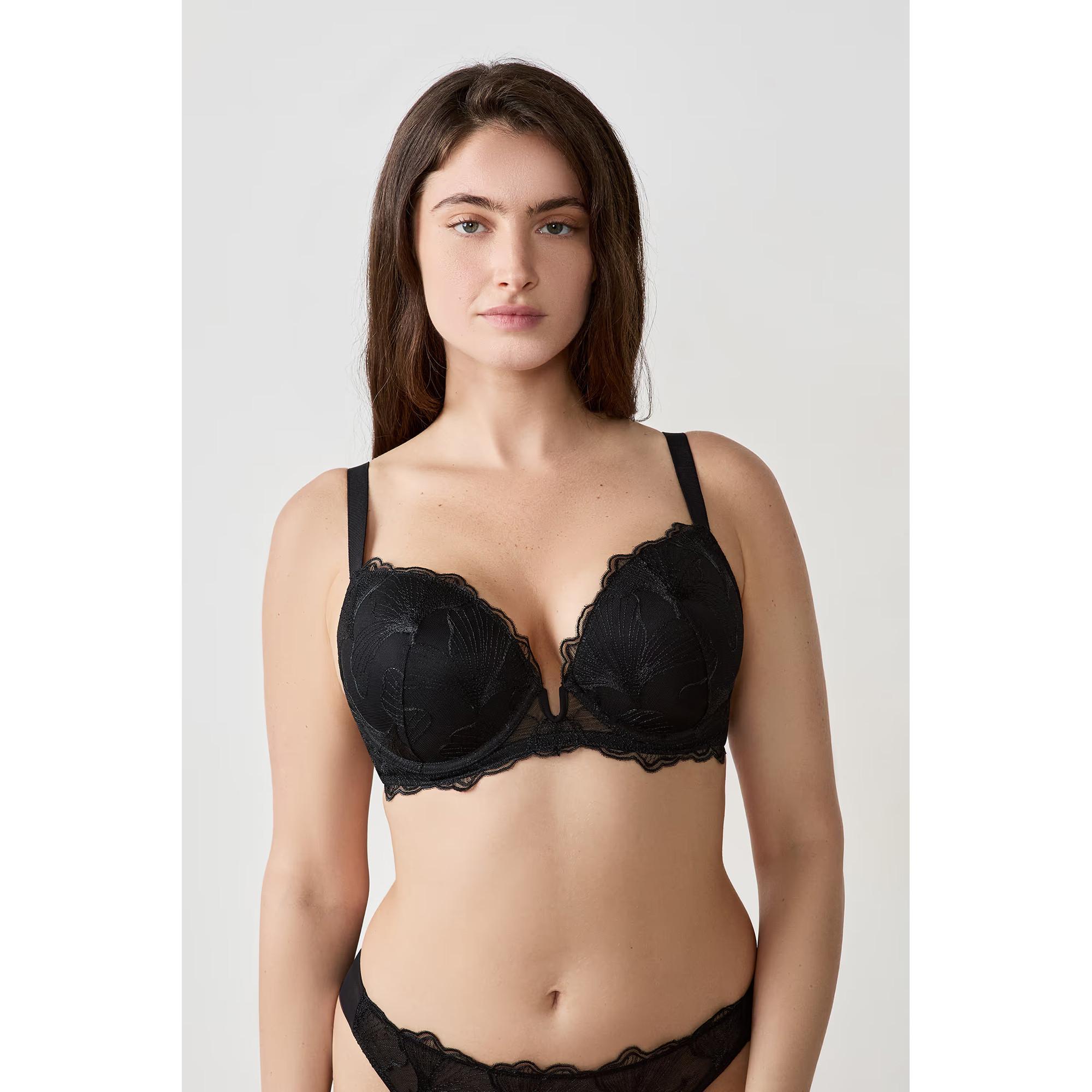 Dieser BH ist mit verstellbaren Trägern und einem klassischen Hakenverschluss ausgestattet. Die Push-up-Form mit tiefem Dekolleté sorgt für ein betontes Volumen und eine feminine Silhouette. Ein raffiniertes Modell für besondere Outfits.