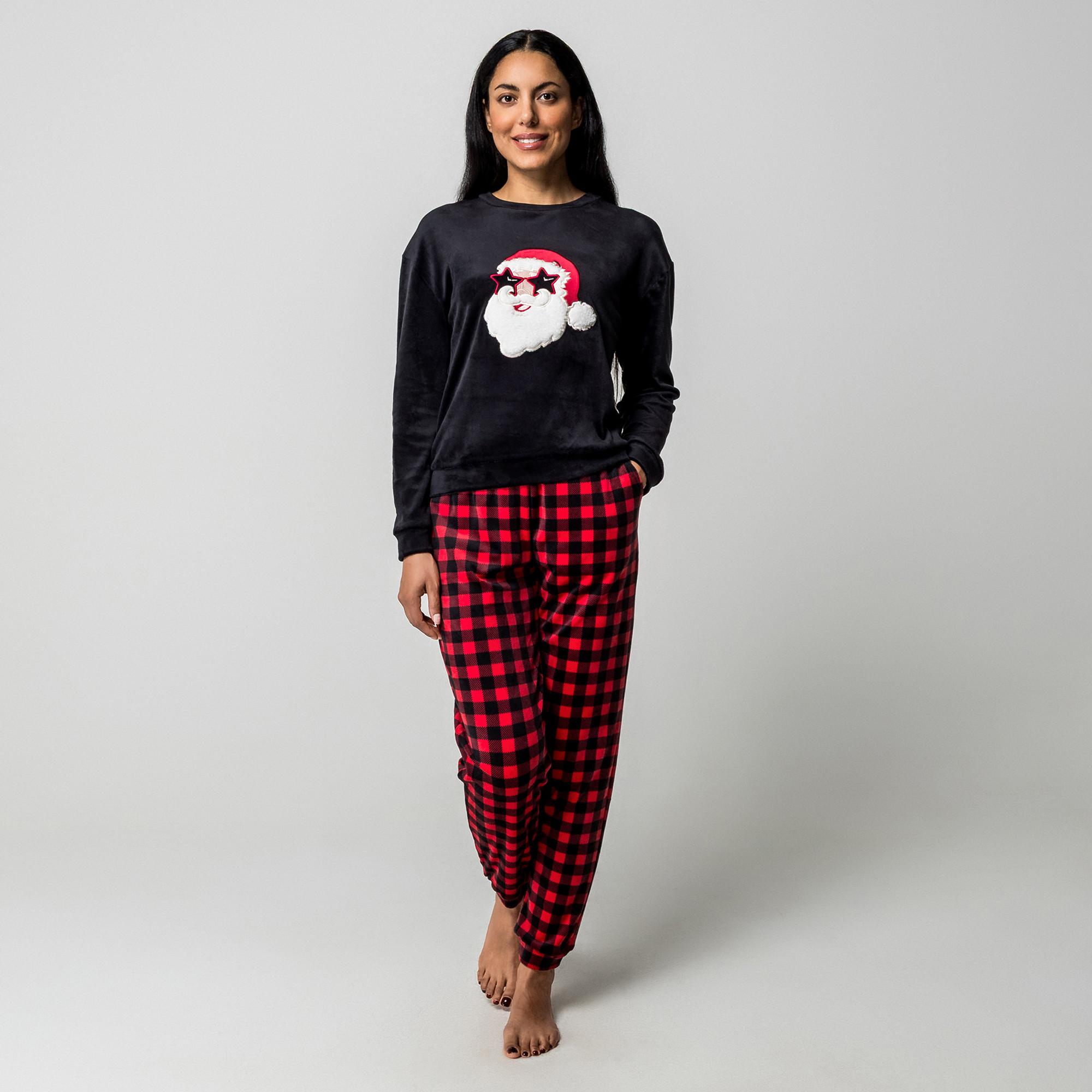 Dieses Pyjama-Set mit festlichem Weihnachtsmotiv ist perfekt für gemütliche Nächte. Das Oberteil hat einen Rundhalsausschnitt und lange Ärmel, die Hose ein klassisches Karomuster.