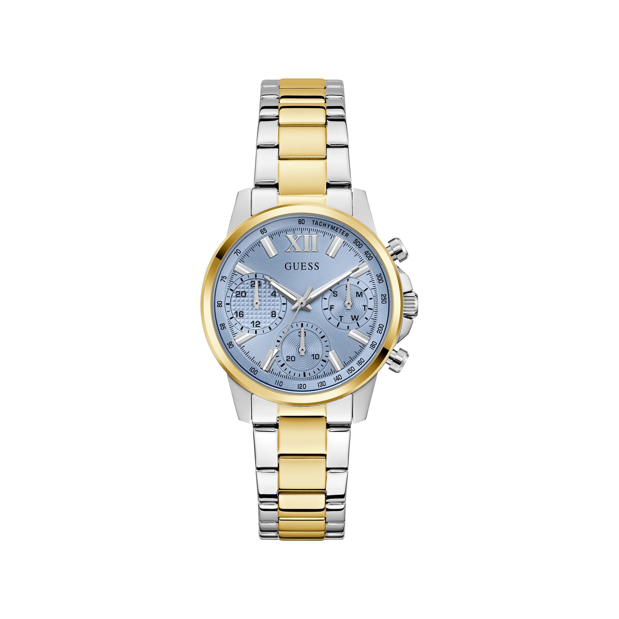 Die Damenarmbanduhr Bailey von Guess kombiniert ein modernes Design mit nachhaltigen Materialien und einem präzisen Multifunktions-Quarzwerk. Ihr zartblaues Zifferblatt mit silberfarbenen Akzenten harmoniert perfekt mit dem Gehäuse und Armband aus recyceltem Edelstahl.