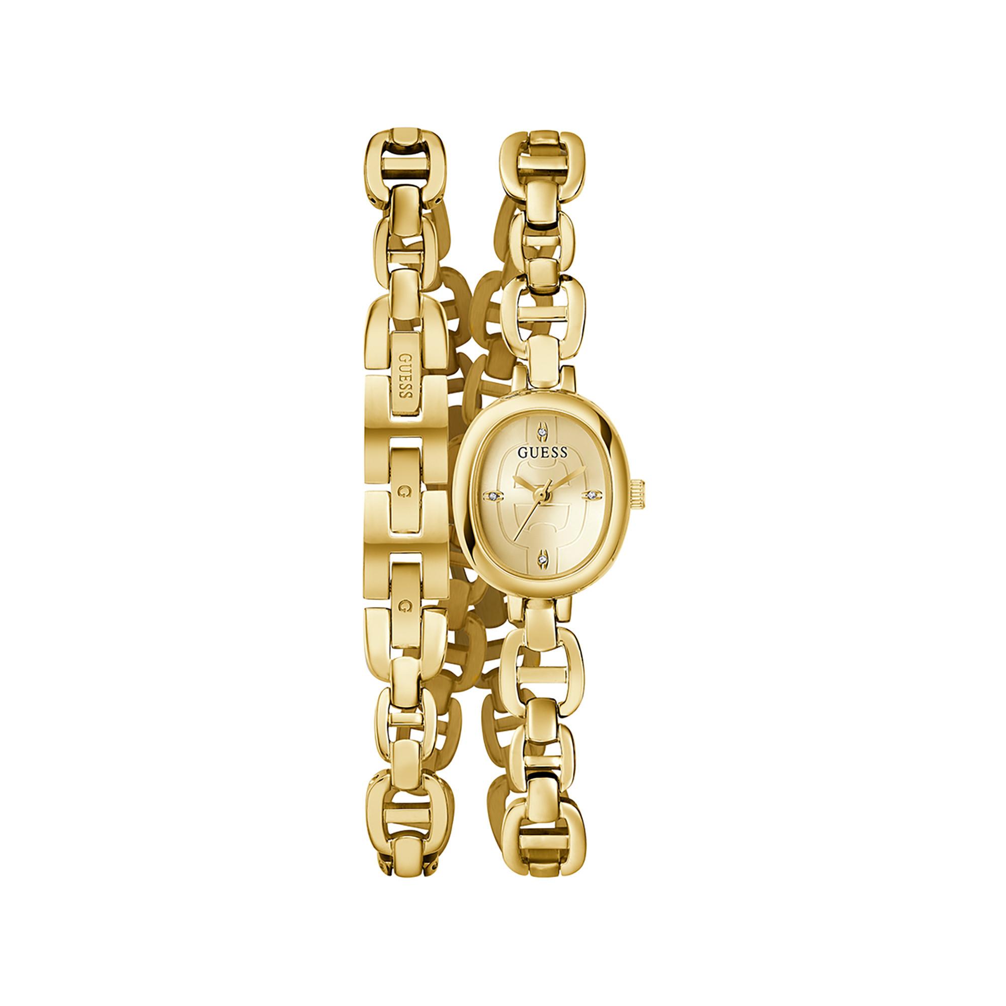 Die Guess Watch Choker vereint Schmuck und Uhr in einem einzigartigen Accessoire, das Eleganz und moderne Akzente kombiniert. Das ovale 24 x 21 mm Gehäuse aus recyceltem, poliertem Edelstahl in Goldton, das champagnerfarbene Sonnenschliff-Ziffernblatt und das flexible Kettendesign erlauben es, die Uhr als doppelt gewickeltes Armband oder als auffälliges Choker-Halsband zu tragen.