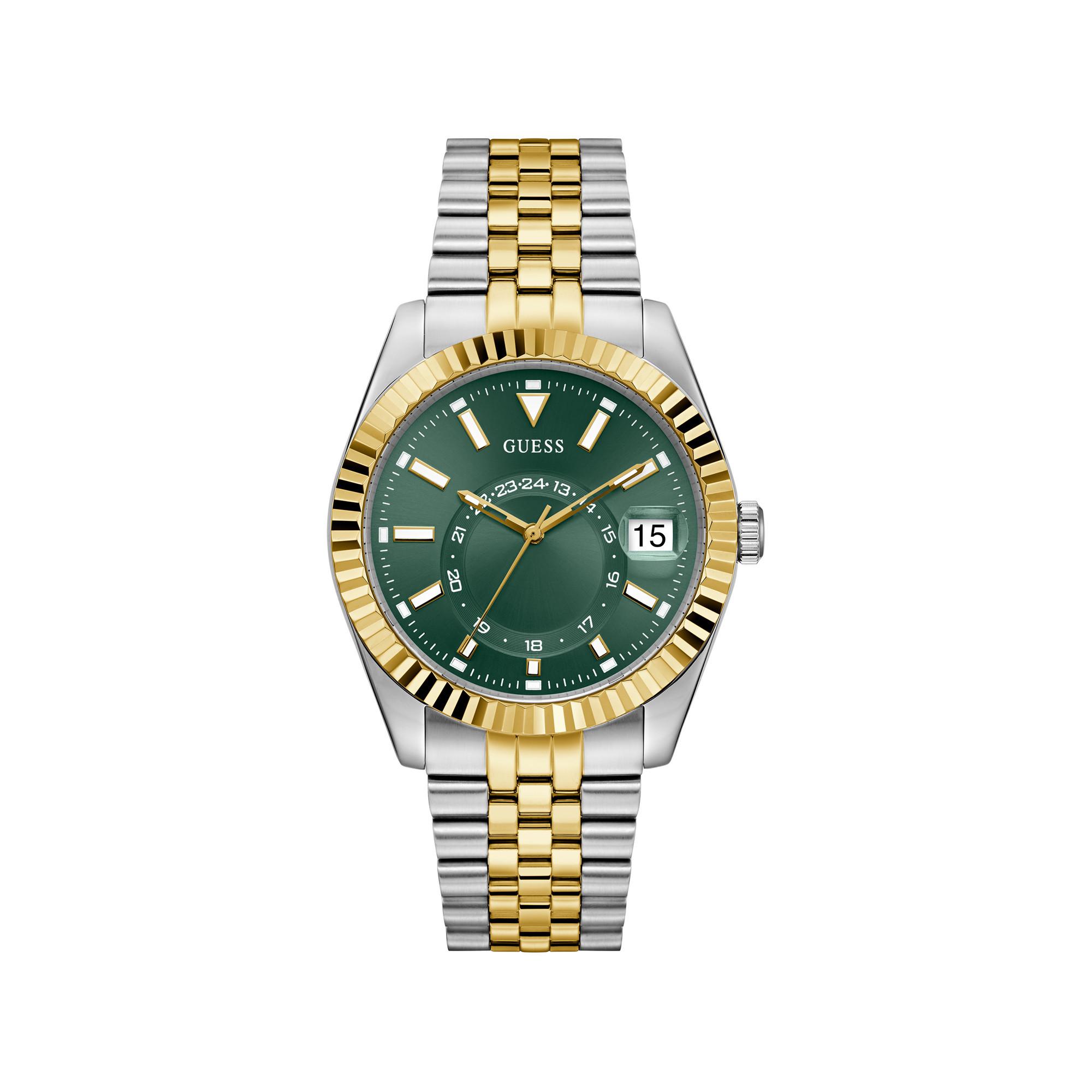 Die Damenarmbanduhr Jaden von Guess besticht durch ihr elegantes Bicolor-Design und vereint moderne Linien mit hochwertiger Handwerkskunst. Gehäuse und Armband aus recyceltem Edelstahl unterstreichen dabei den nachhaltigen Anspruch dieses stilvollen Modells.