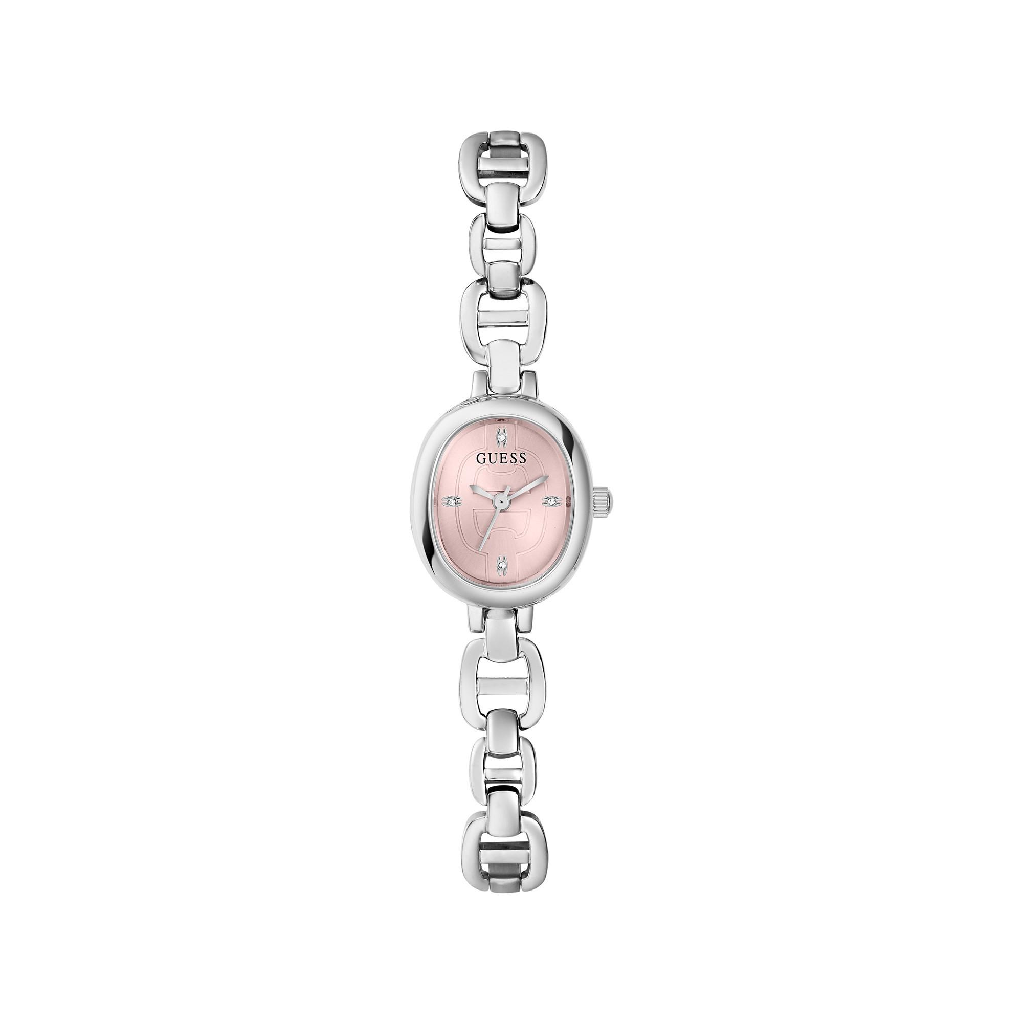 Die Damenarmbanduhr von Guess besticht mit ihrem filigranen 21 mm Gehäusedurchmesser und einem zarten rosafarbenen Zifferblatt, das durch silberne Zeiger und funkelnde Steinchen verziert ist. Gefertigt aus recyceltem Stahl und geschützt durch gehärtetes Mineralglas, kombiniert sie nachhaltige Materialien mit einem eleganten Design.
