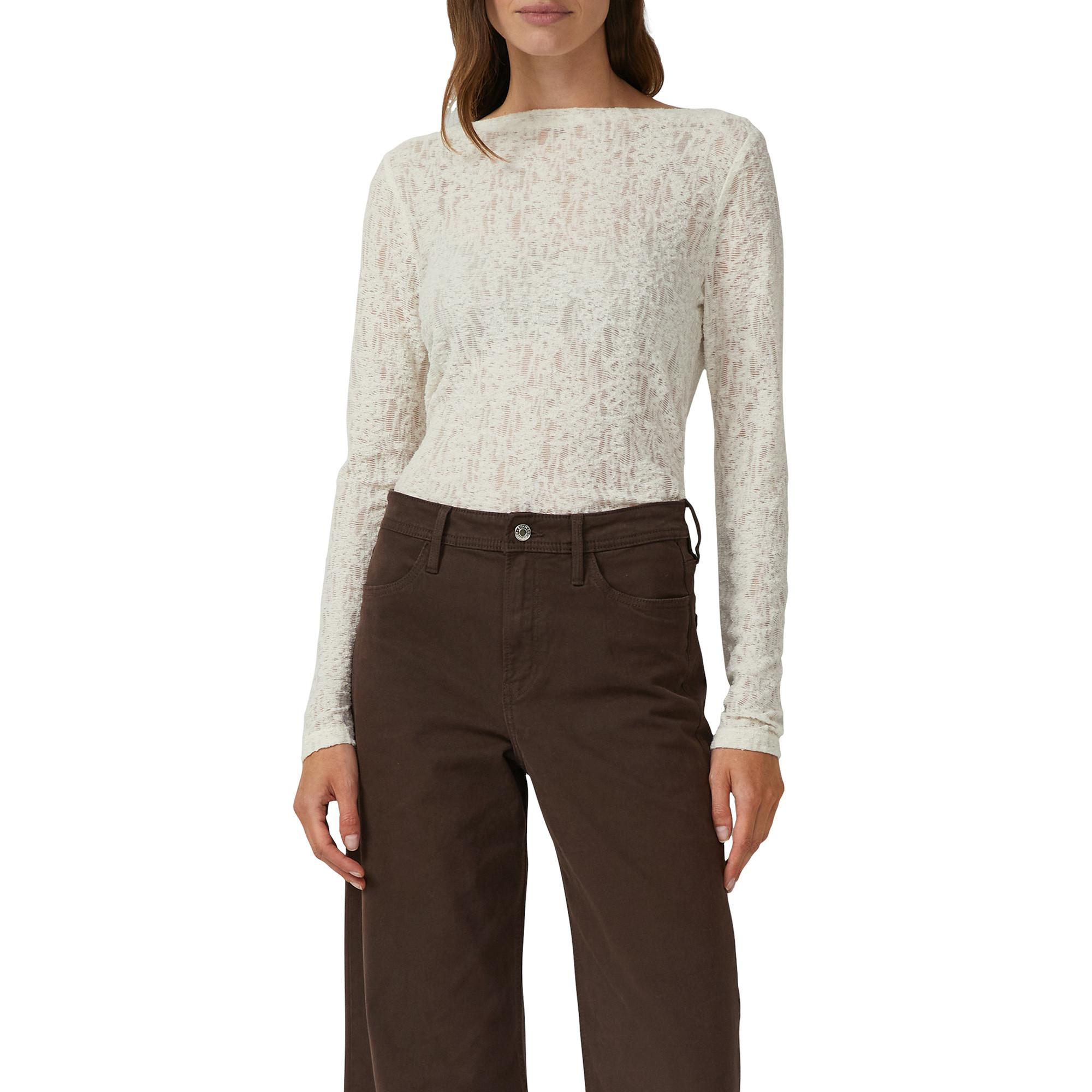 Dieses strukturierte Langarm-Shirt aus feiner Jersey-Spitze bringt feminine Eleganz in den Alltag. Der U-Boot-Ausschnitt und die körpernahe Slim-Fit-Passform sorgen für eine stilvolle Silhouette – ein charmantes Essential. Es ist ideal für vielseitige Kombinationen von casual bis chic.