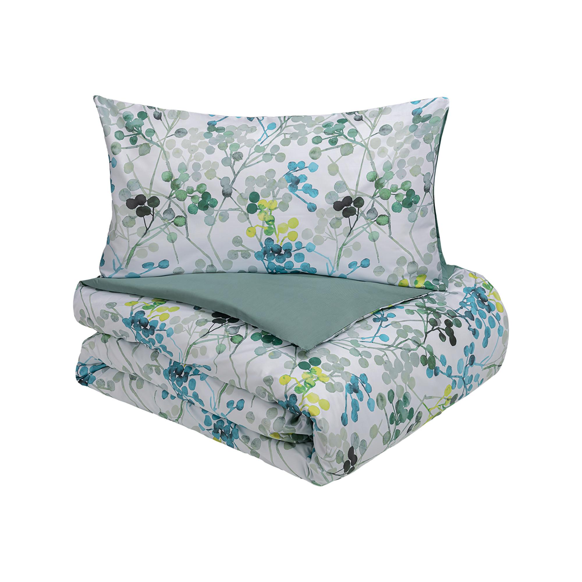 Die Kollektion BACCHE zelebriert die Hartnäckigkeit der Natur, mit einsamen Zweigen, die aus dem Schnee ragen und den Elementen trotzen. Das zarte Design fängt durch ein Spiel von Transparenzen, Farbschichten und subtilen Schattierungen die winzigen Früchte der kalten Jahreszeit ein, die wie poetische Verse in der Stille der Nacht erscheinen. Die vorgeschlagene Farbpalette umfasst Grüntöne, die durch säuerliche Akzente belebt werden, und warme Burgundertöne, die in satte Kürbistöne übergehen. Die Oberseite des Bett- und Kissenbezugs besteht aus edlem, digital bedrucktem Perkal aus reiner Baumwolle, die andere Seite ist aus einfarbigem Perkal gefertigt.