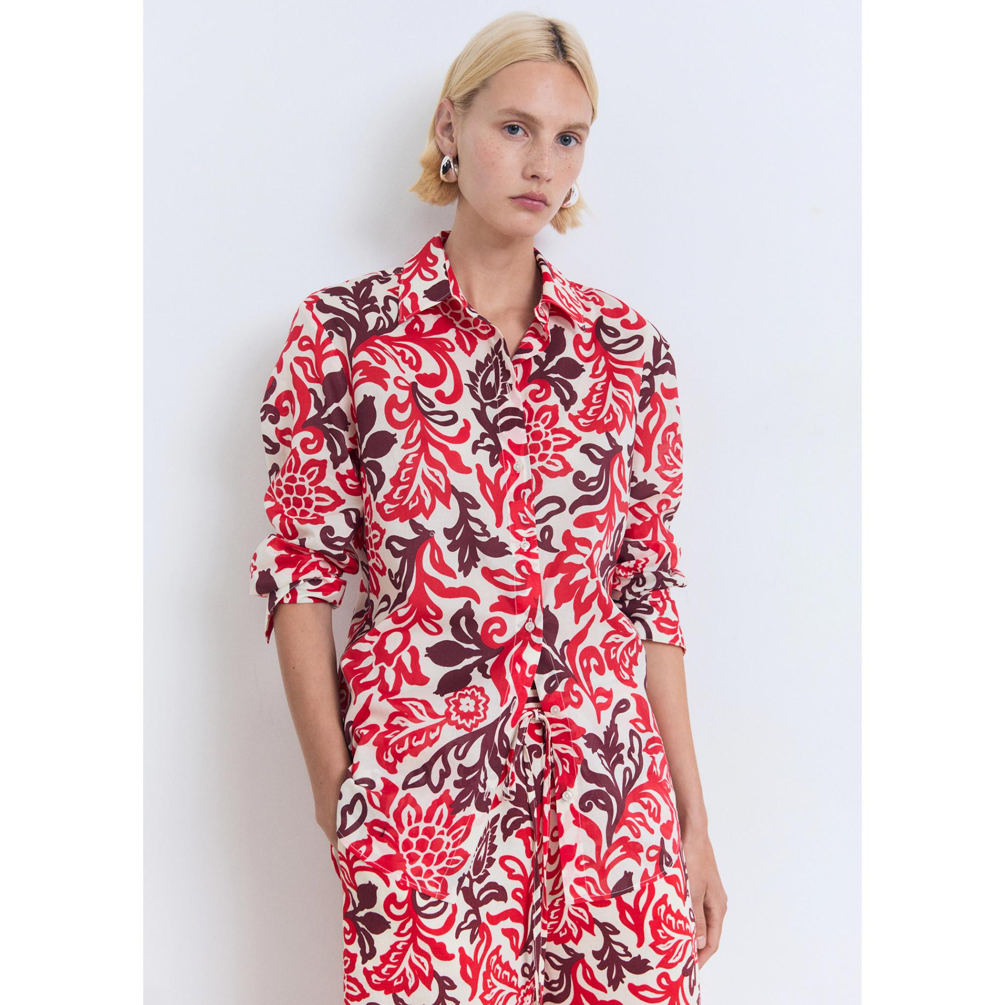 Diese Bluse besteht aus 100 % Baumwolle und zeigt ein florales Muster in einem geraden Schnitt. Sie hat einen klassischen Hemdkragen, lange Ärmel und einen Knopfverschluss vorne. Diese Bluse ist ideal für einen stilvollen Gesamtlook.