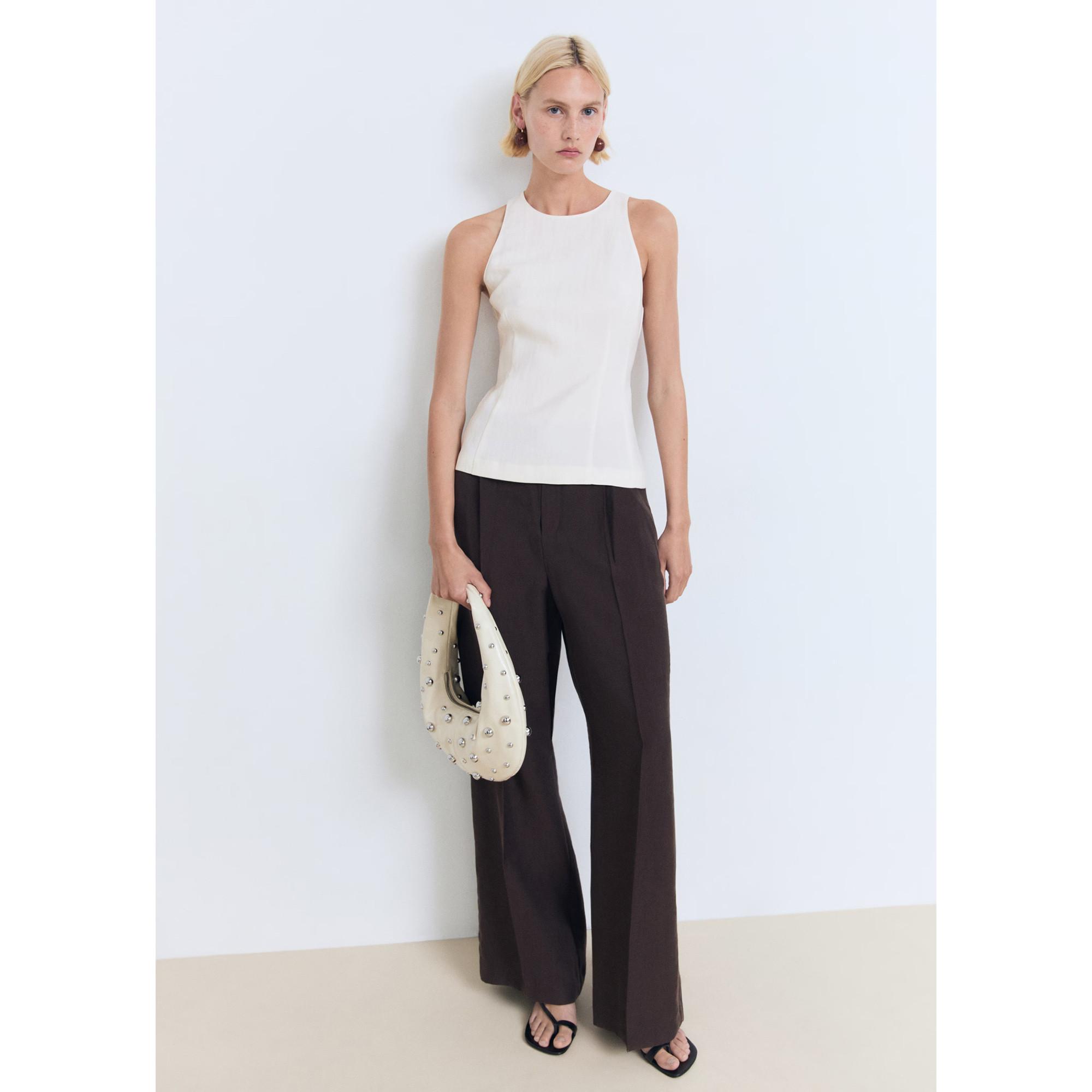 Die taillierte Halterbluse präsentiert sich mit einem ausgestellten Design, einem eleganten Neckholder-Ausschnitt und breiten Trägern. Der Reissverschluss am Rücken sorgt für eine präzise Passform und ein sauberes Finish. Diese Bluse ist ideal für stilvolle Sommer-Looks mit femininer Silhouette.