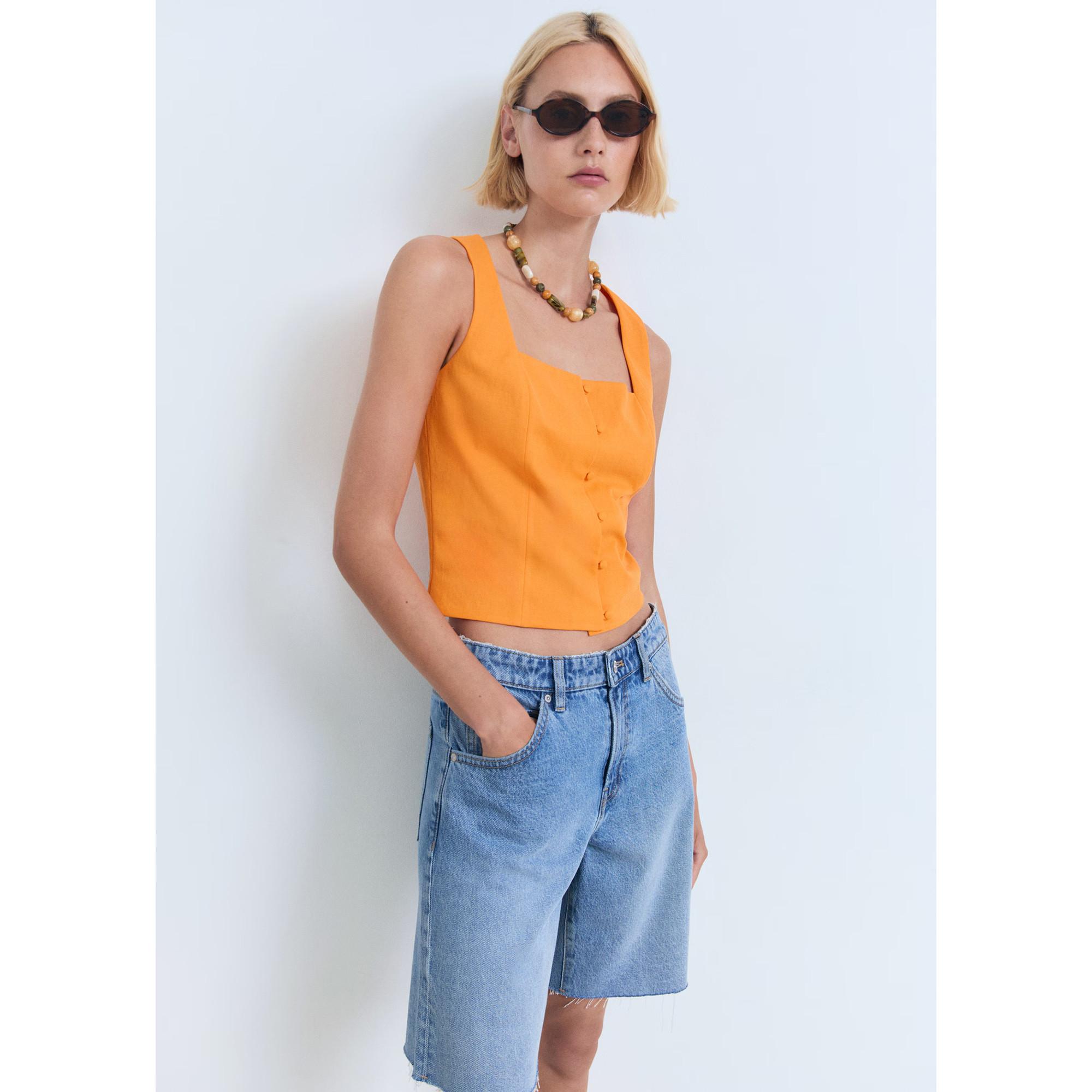 Dieses Mango Baumwoll-Top kombiniert Komfort und Stil mit einem geraden Schnitt und einem tiefen Ausschnitt. Die Knopfleiste vorne verleiht dem Design eine klassische Note. Es ist ideal für lässige Alltagslooks mit sommerlichem Flair.