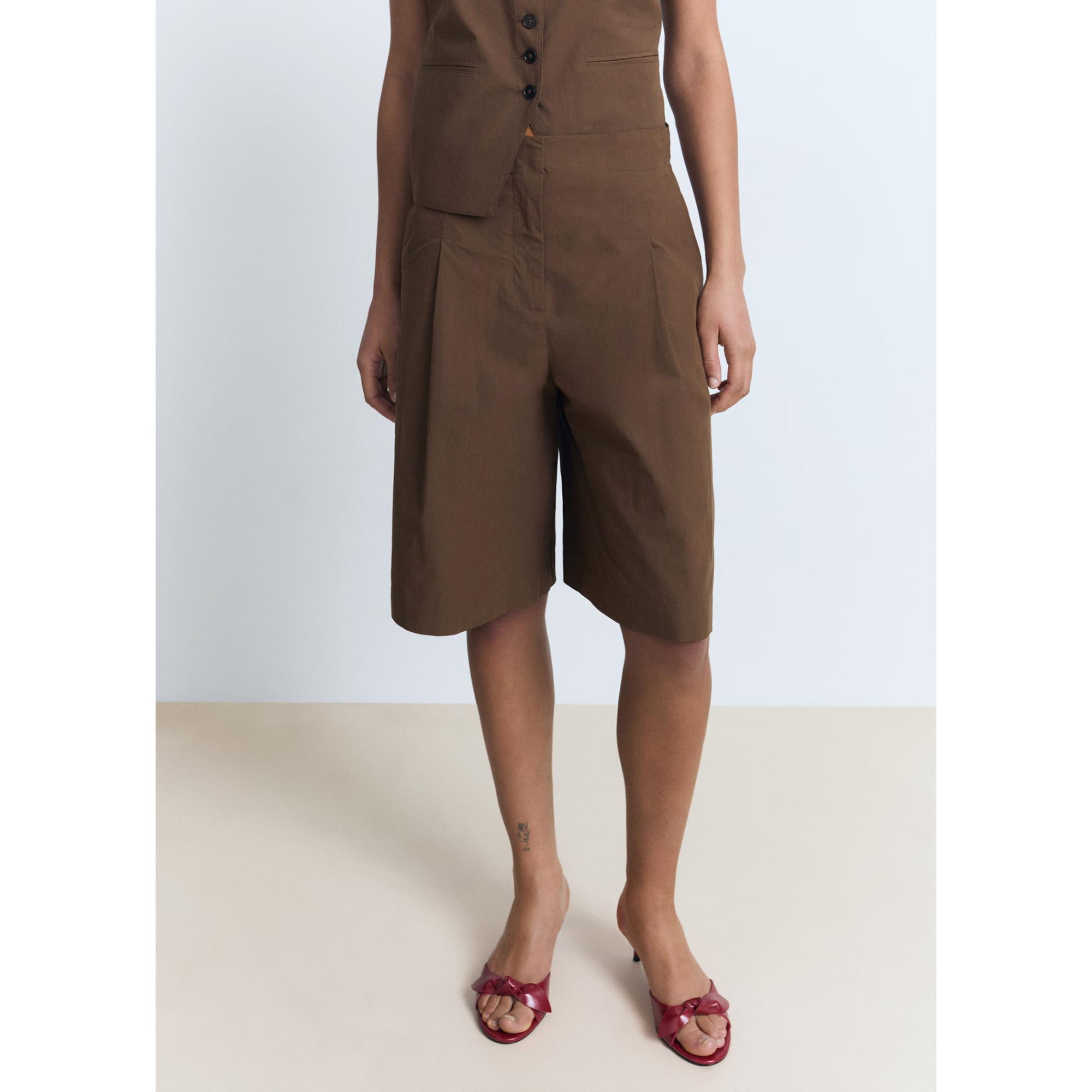 Die Bermuda Shorts bestehen aus 100 % Baumwolle und bieten ein elegantes, gerades Design mit Bundfalten. Sie verfügen über zwei Seitentaschen, zwei Leistentaschen hinten und einen seitlichen Knopfverschluss. Der verdeckte Knopf-, Haken- und Reissverschluss sorgt für einen sauberen Look.