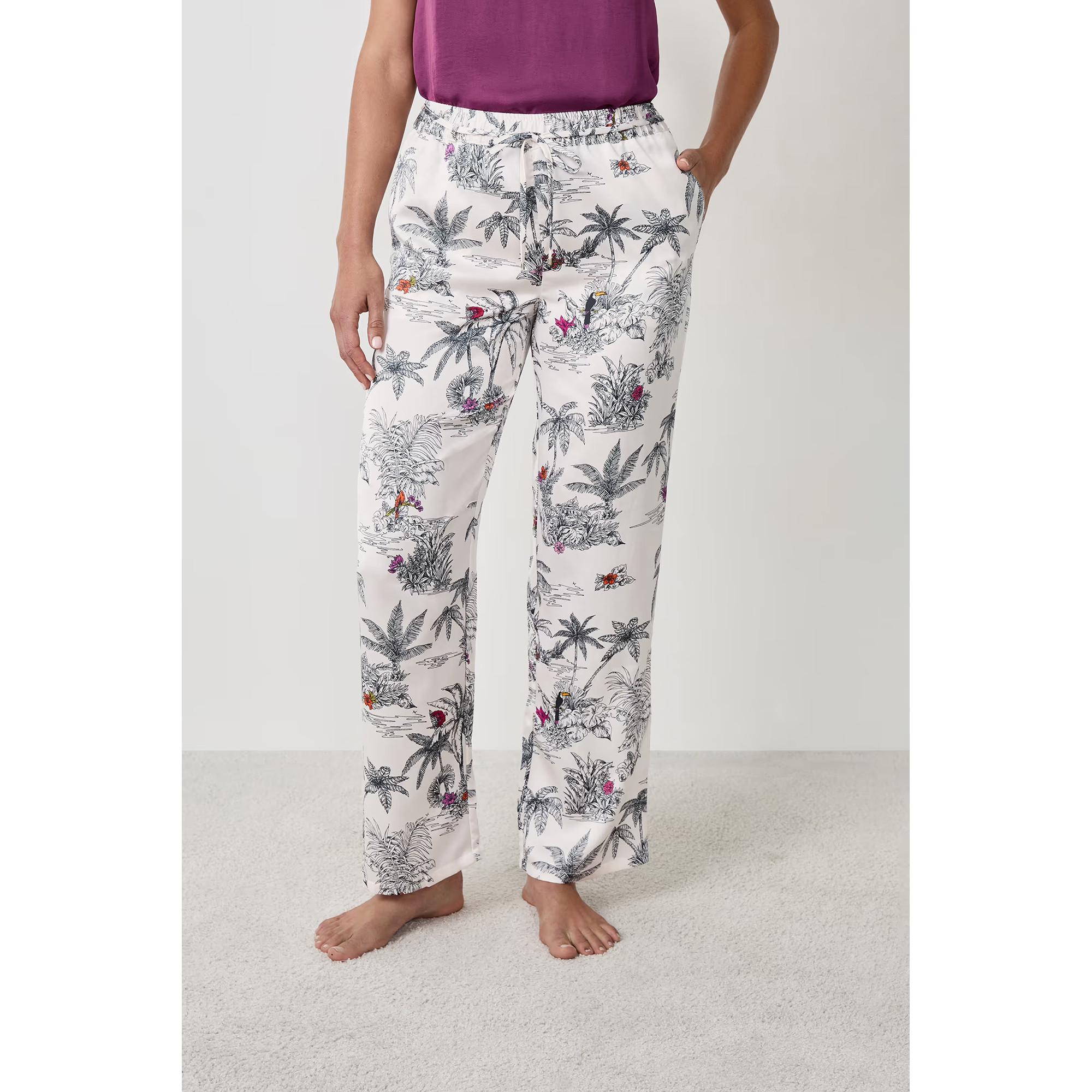Die Pyjamahose ist mit eleganten Palmendrucken verziert und bringt Urlaubsflair in die Nachtwäsche. Der elastische Bund mit Bindekordel sorgt für eine bequeme Passform und betont sanft die Silhouette. Perfekt für gemütliche Abende zu Hause oder als Teil eines stilvollen Pyjama-Sets.