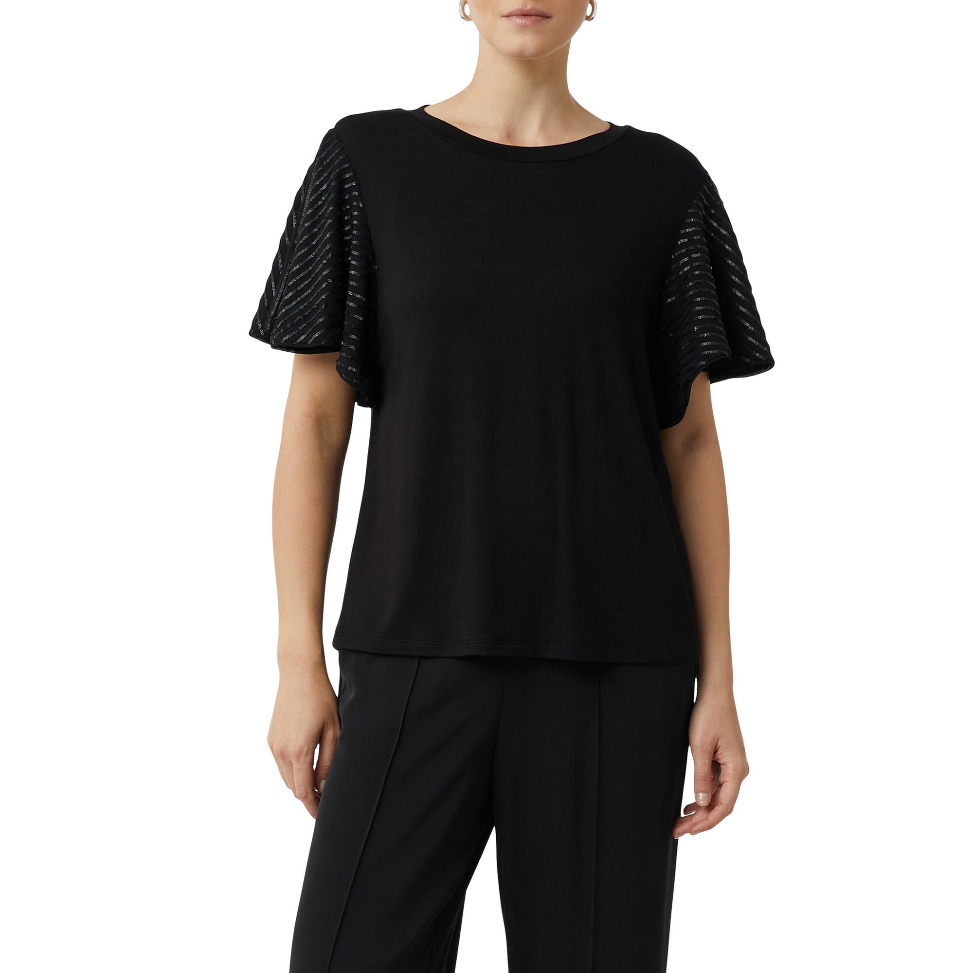 Dieses T-Shirt verfügt über einen klassischen Rundhalsausschnitt und kurze Rüschenärmel. Die Ärmel sind mit einem dezenten Streifenmuster verziert, das dem Design einen Hauch von Eleganz verleiht. Dieses vielseitige Oberteil kann für verschiedene Anlässe schick oder lässig kombiniert werden.