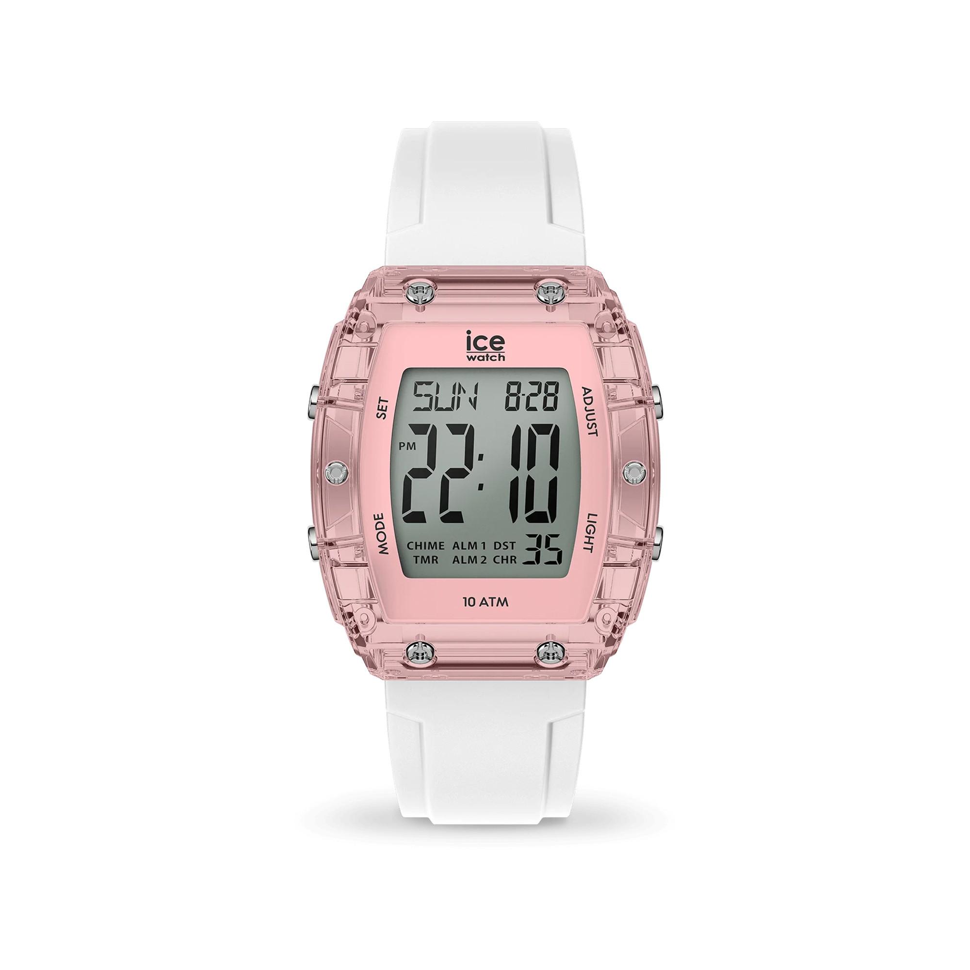 Die ICE digit boliday - White Clear pink Silver bietet ein sanftes und gleichzeitig retro-futuristisches Design. Ihr weisses Silikonarmband und das rosafarbene, transparente Gehäuse sind eine harmonische Mischung aus Modernität und Vintage-Charme. Auf dem digitalen Display können Sie die Uhrzeit und das Datum bequem ablesen, während Sie die Uhr dank ihrer Wasserdichtigkeit von 10 ATM ohne Bedenken unter Wasser mitnehmen können. Dieses Modell vereint auf perfekte Weise einen schicken Stil mit einer futuristischen Note, die sich jeder Situation anpasst.