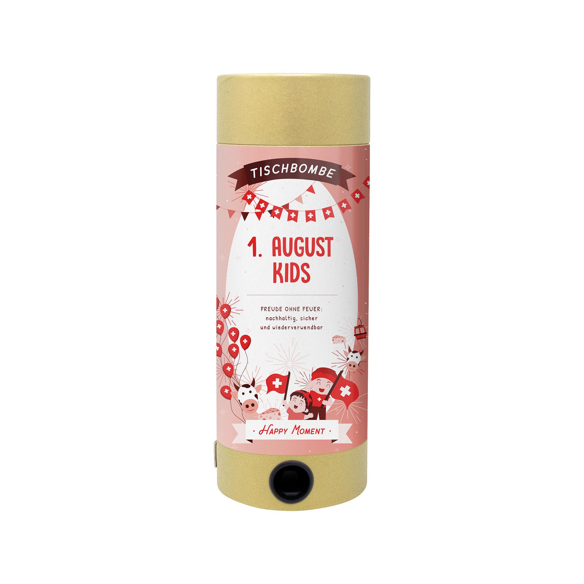 Die Tischbombe ist mit einem vorgefertigten 1. August Kids-Design bedruckt. Mit Tattoos, bunten Gesichtsfarben, einer kinderfreundlichen 1. August-Playlist und kreativer Deko wird der Nationalfeiertag zu einem echten Erlebnis. Ob schminken, malen, mitsingen oder einfach staunen – hier ist alles dabei, um den 1. August fröhlich und bunt zu feiern.