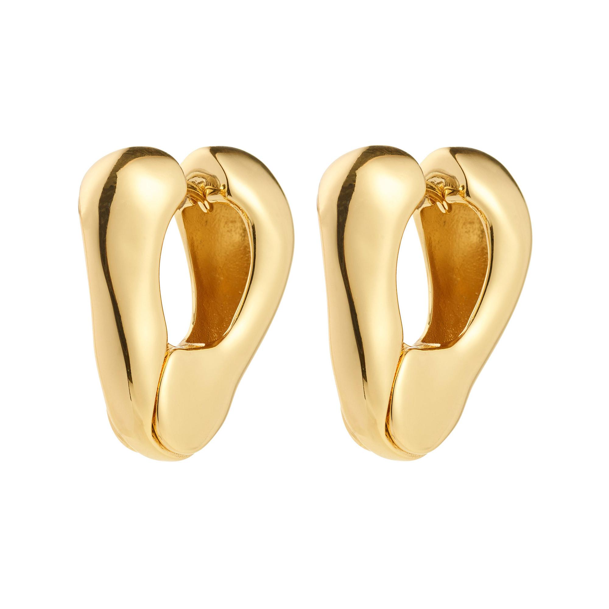 Die vergoldeten Hoops aus der Free Kollektion von Pilgrim verbinden skulpturale Formen mit einem edlen, glänzenden Finish und einem natürlichen, lebendigen Ausdruck. Sie bestehen zu 99 % aus recyceltem Material und sind dank des praktischen Klickverschlusses ideal für mühelose Alltagslooks.