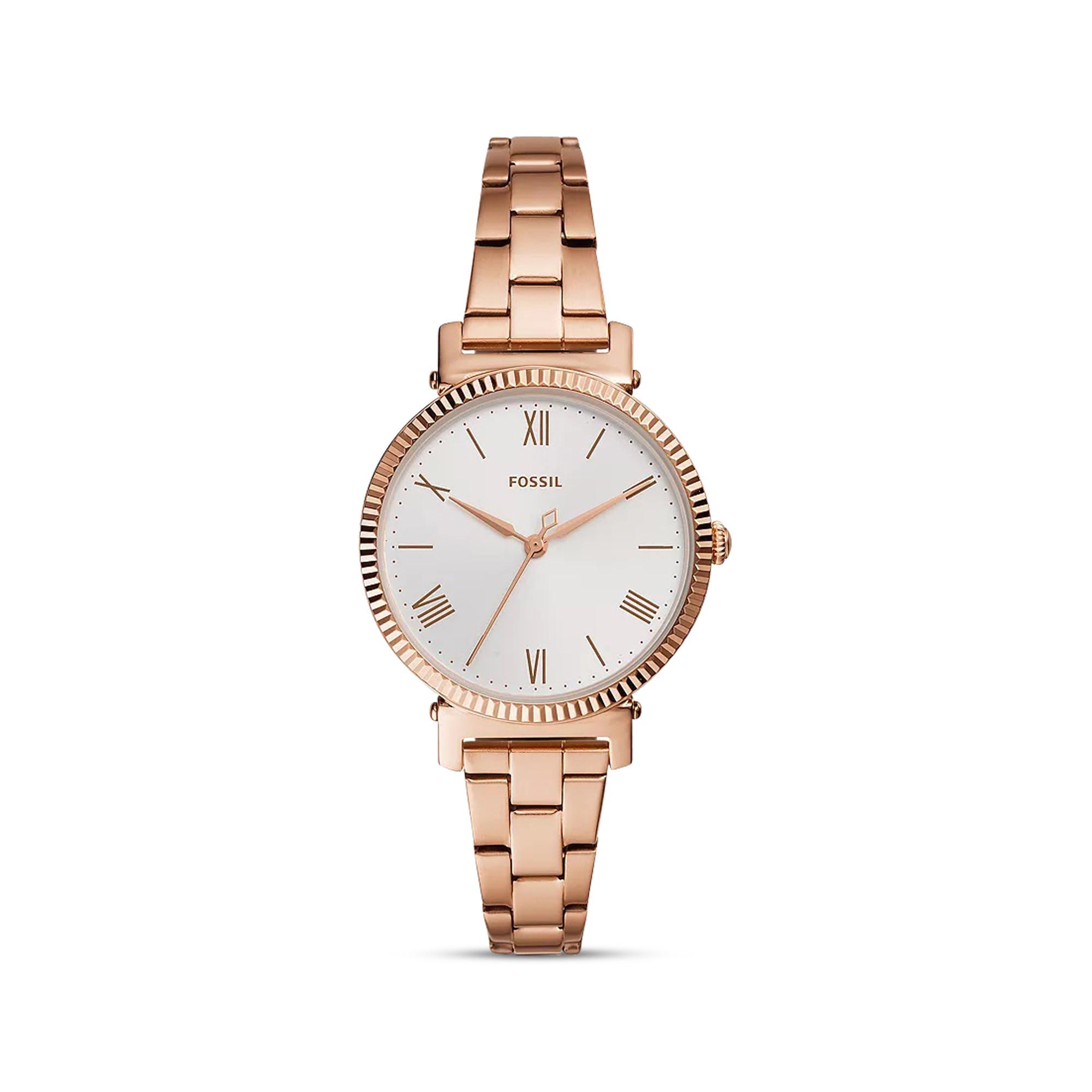 Die 34 mm grosse Uhr Daisy von Fossil besticht durch ihr elegantes Design mit silberfarbenem Sonnenschliff-Zifferblatt und geriffelter Lünette. Das roségoldfarbene Edelstahlarmband verleiht ihr einen femininen und zugleich zeitlosen Look.