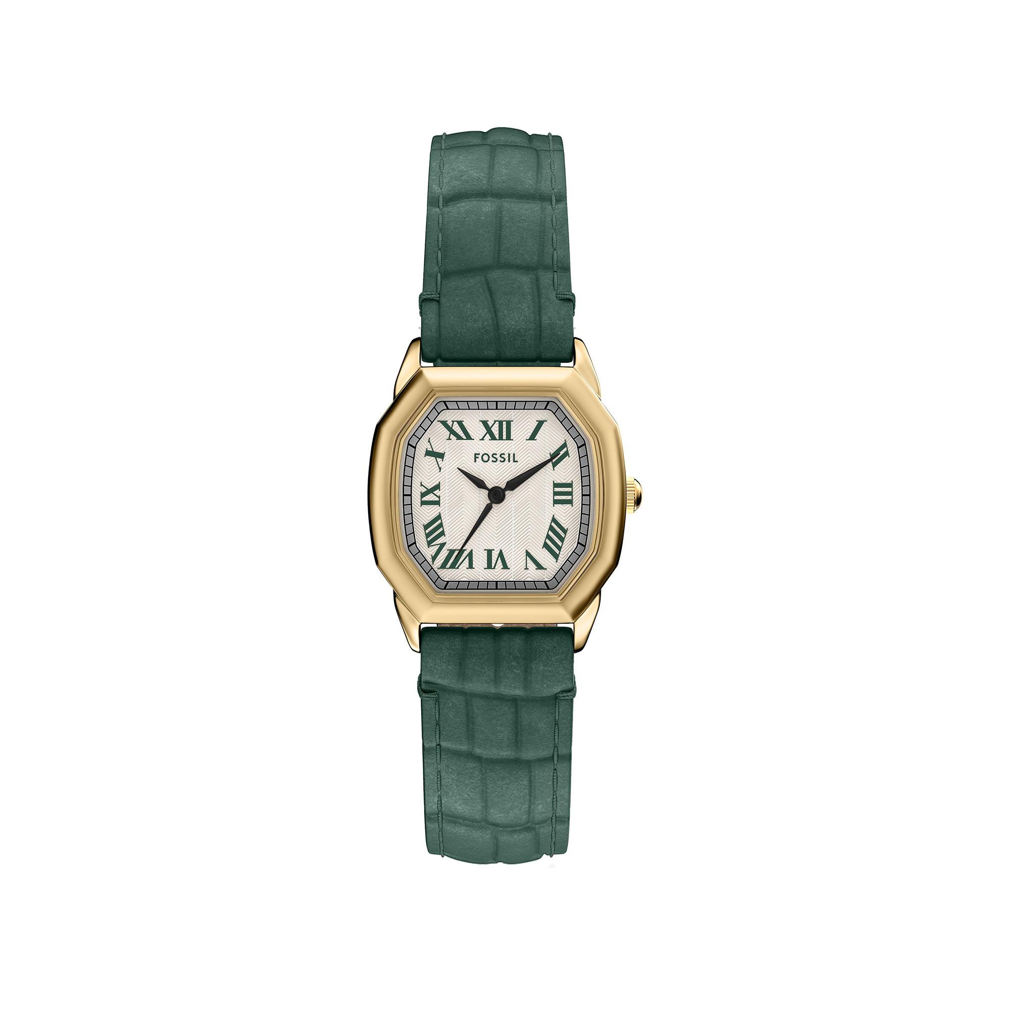 Ein achteckiges goldfarbenes Gehäuse umrahmt das strukturierte cremefarbene Zifferblatt und verleiht dieser kleinen Uhr eine unverwechselbare Silhouette. Das grüne Lederband mit Krokoprägung schafft Tiefe und ergänzt die warmen Töne des Gehäuses. Dieser aus Edelstahl und Leder gefertigte Style vereint ein durchdachtes Design mit einer hochwertigen Ausführung.