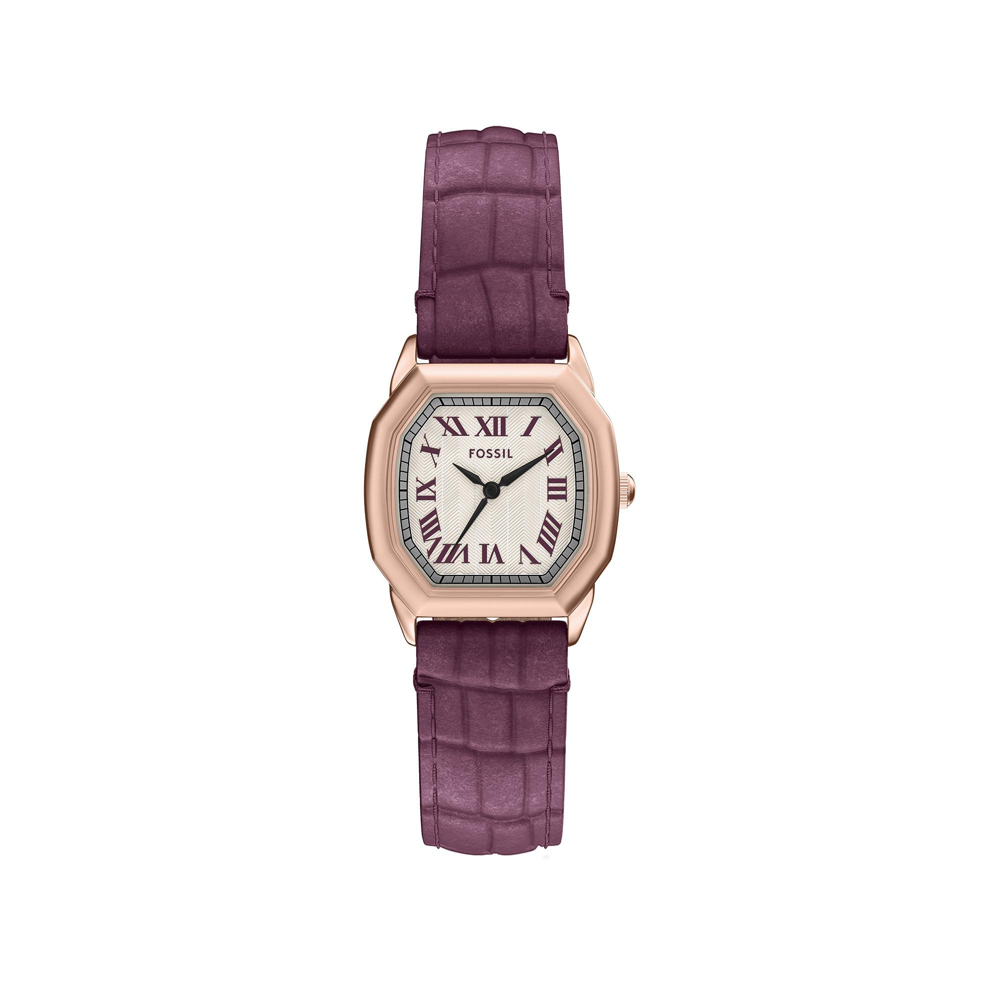 Das achteckige roségoldfarbene Edelstahlgehäuse bildet eine raffinierte Grundlage für diese Uhr mit cremefarbenem strukturiertem Zifferblatt, das für zusätzliche Tiefe erzeugt. Ein weinrotes Lederband mit Krokoprägung steht im eleganten Kontrast zu dem warmen Metallic-Finish und sorgt für ein raffiniertes Zusammenspiel von Farbe und Textur. Dieses Modell mit 3-Zeiger-Werk hat ein raffiniertes Design und wurde mit viel Liebe zum Detail gefertigt.
