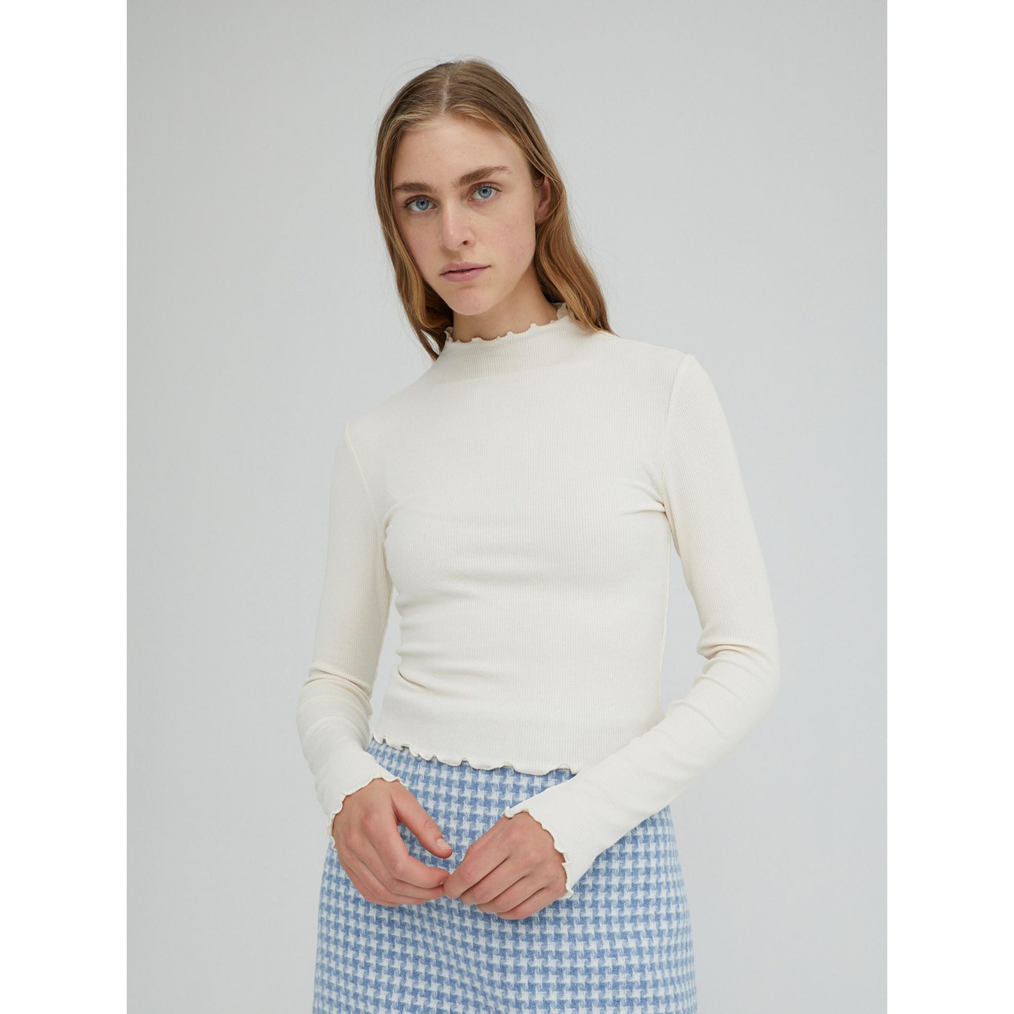 Dieses Langarm-Top verfügt über eine gerippte Textur und einen hohen Kragen, der eine bequeme und stilvolle Passform bietet. Der Rüschenbesatz an Kragen und Ärmelbündchen verleiht dem Design eine zarte Note.