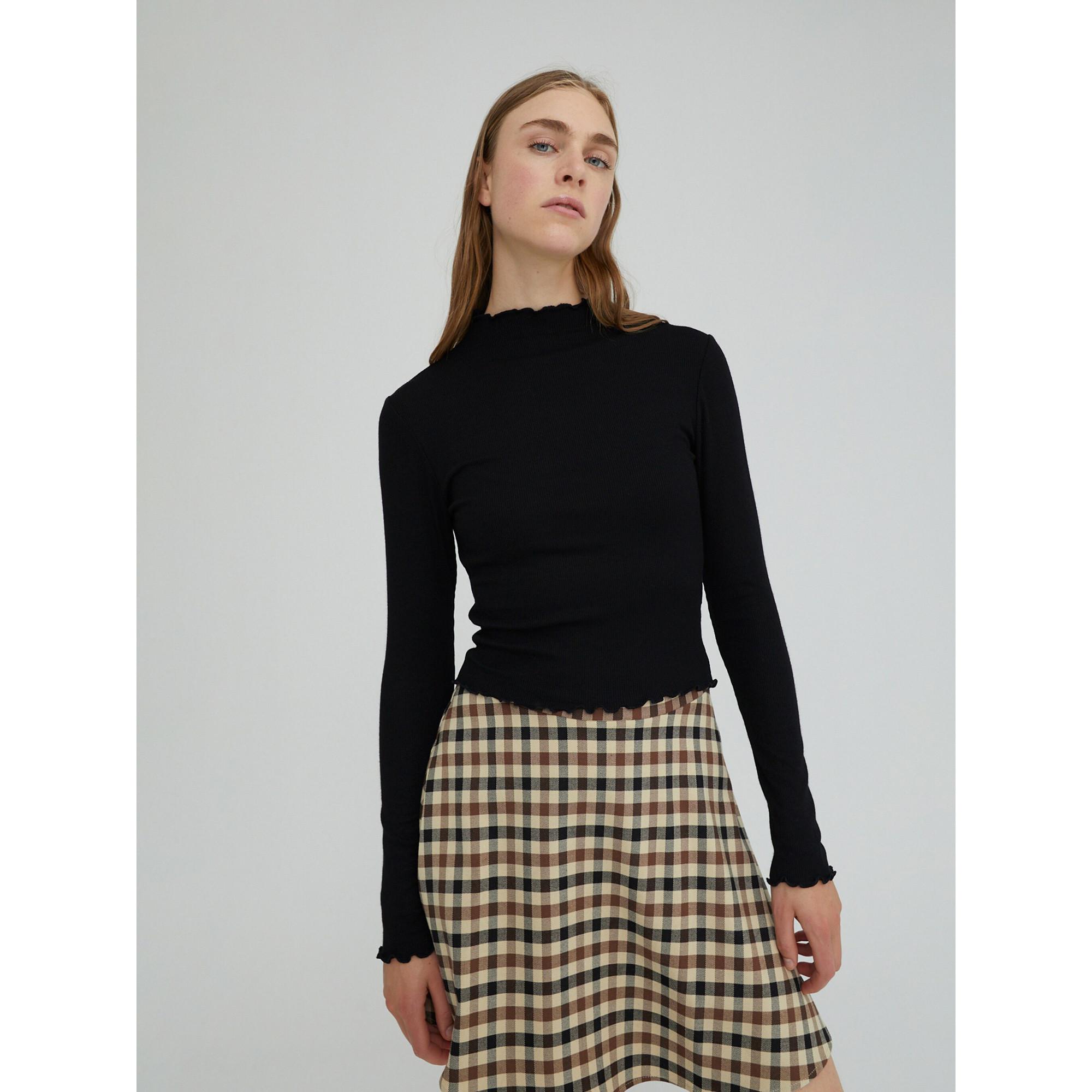 Dieses langärmlige Top verfügt über eine gerippte Textur und einen Stehkragen, der eine bequeme und stilvolle Passform bietet. Der Wellensaum an Kragen, Ärmelbündchen und Saum verleiht dem Design ein zartes und verspieltes Detail.